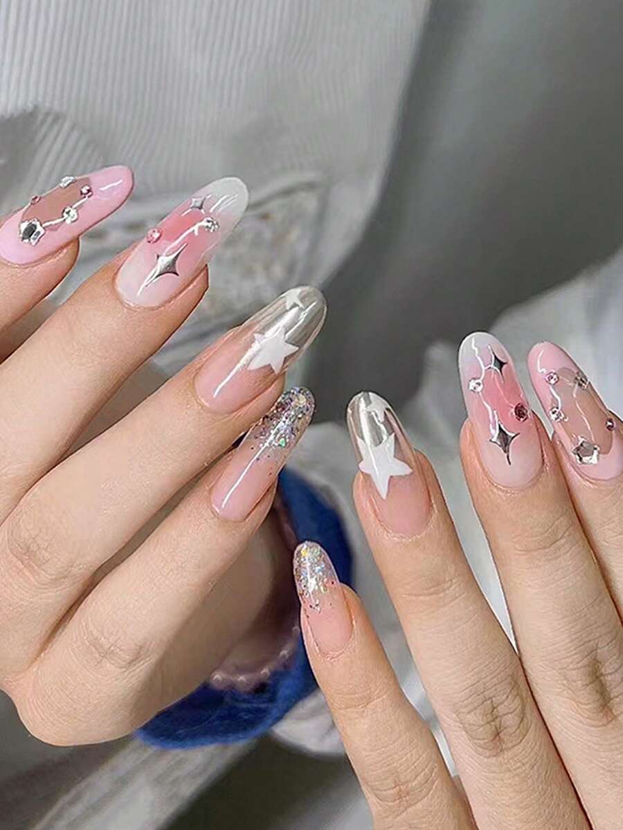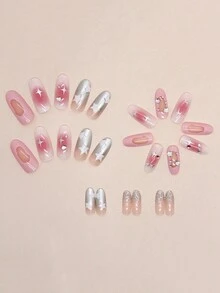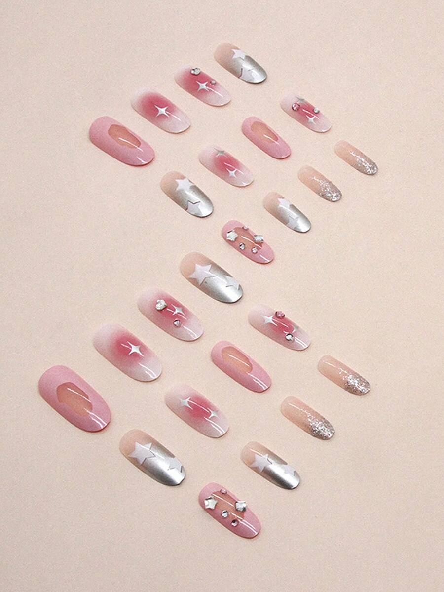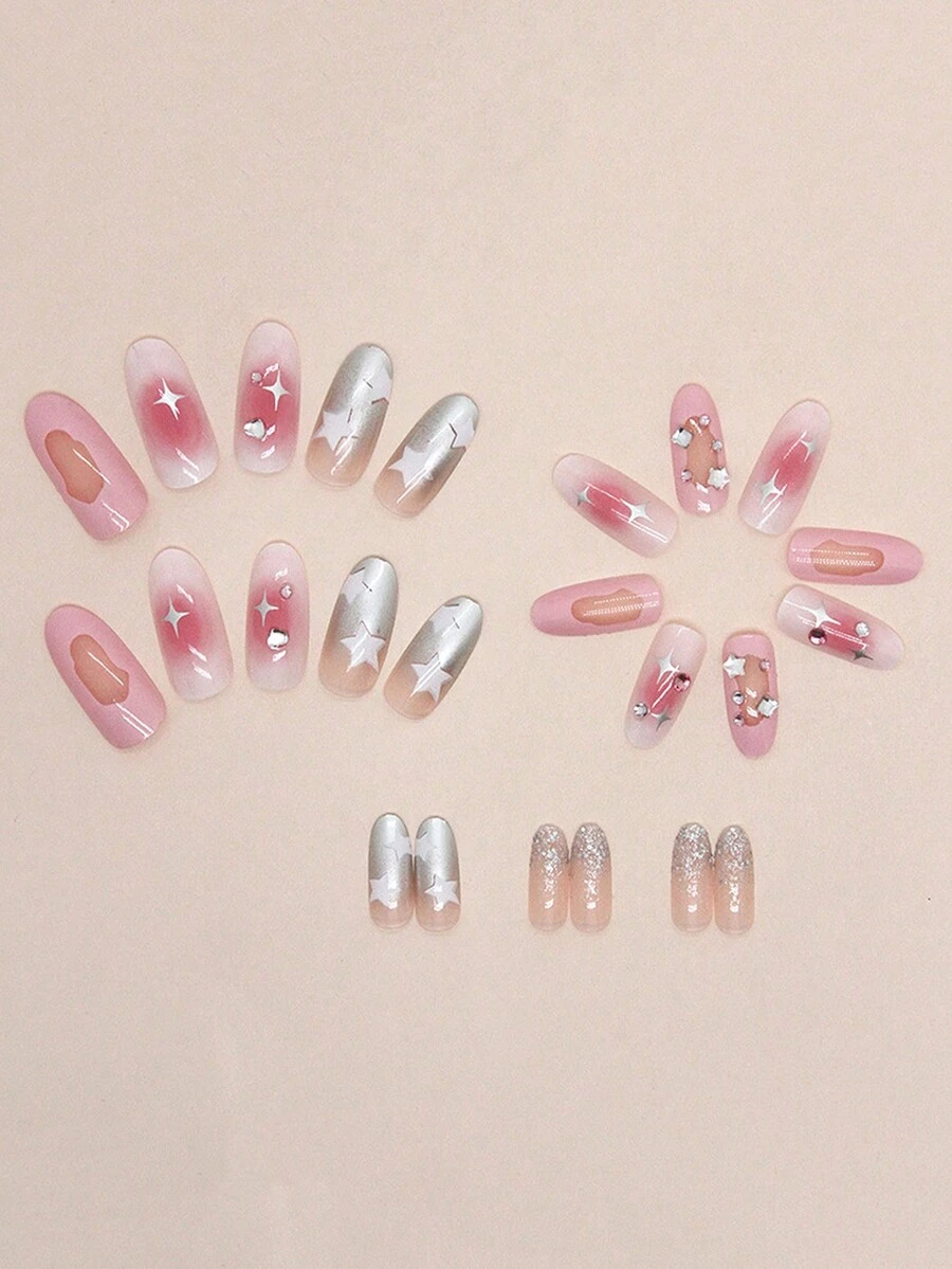 Kawaii 24pcs Star & Heart Shaped Fake Nail Tips And One Piece Of Tape