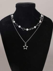 Kawaii 2pcs Bohemian Style Simple Faux Pearl Hollow Out Five-Pointed Star Collarbone Necklace, Lady Star-Shaped Beaded Necklace Set