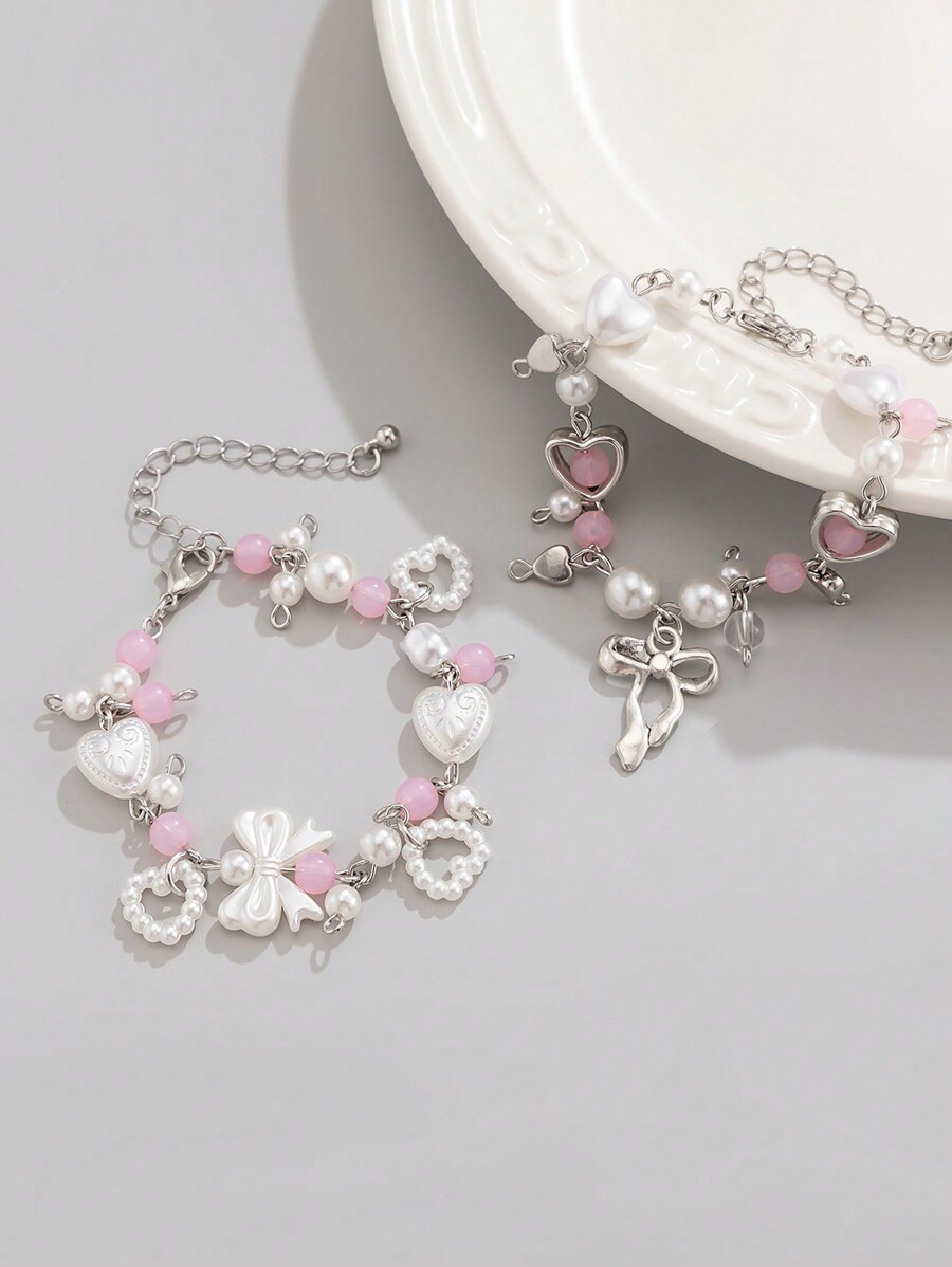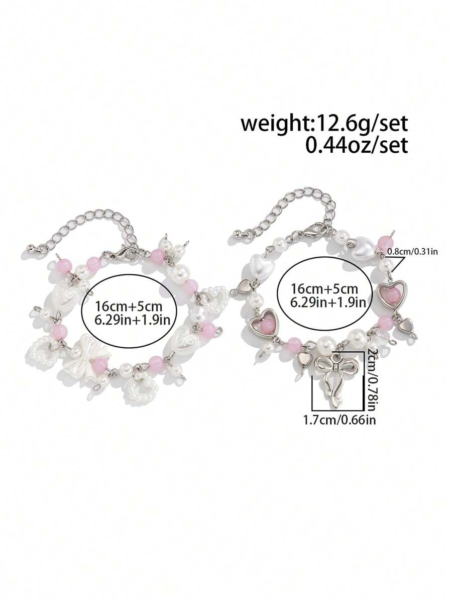 Kawaii 2pcs Lovely Sweetheart Bow Faux Pearl Pendant Bracelet Set, Friendship & Couple Gift, Valentine's Day Present Valentines,Mom,Mother,Mother's Day,Gift