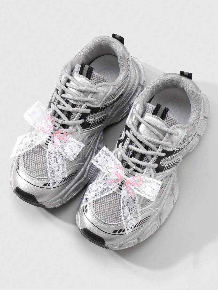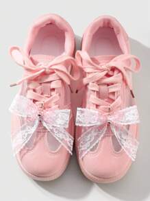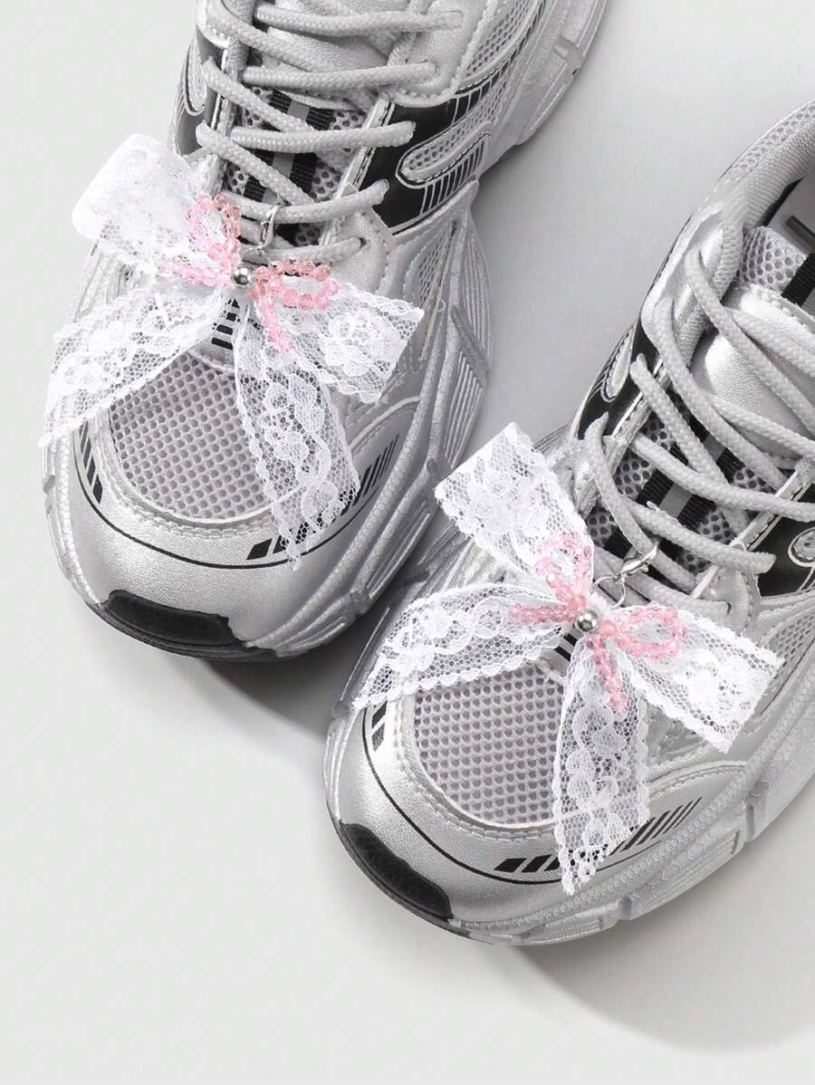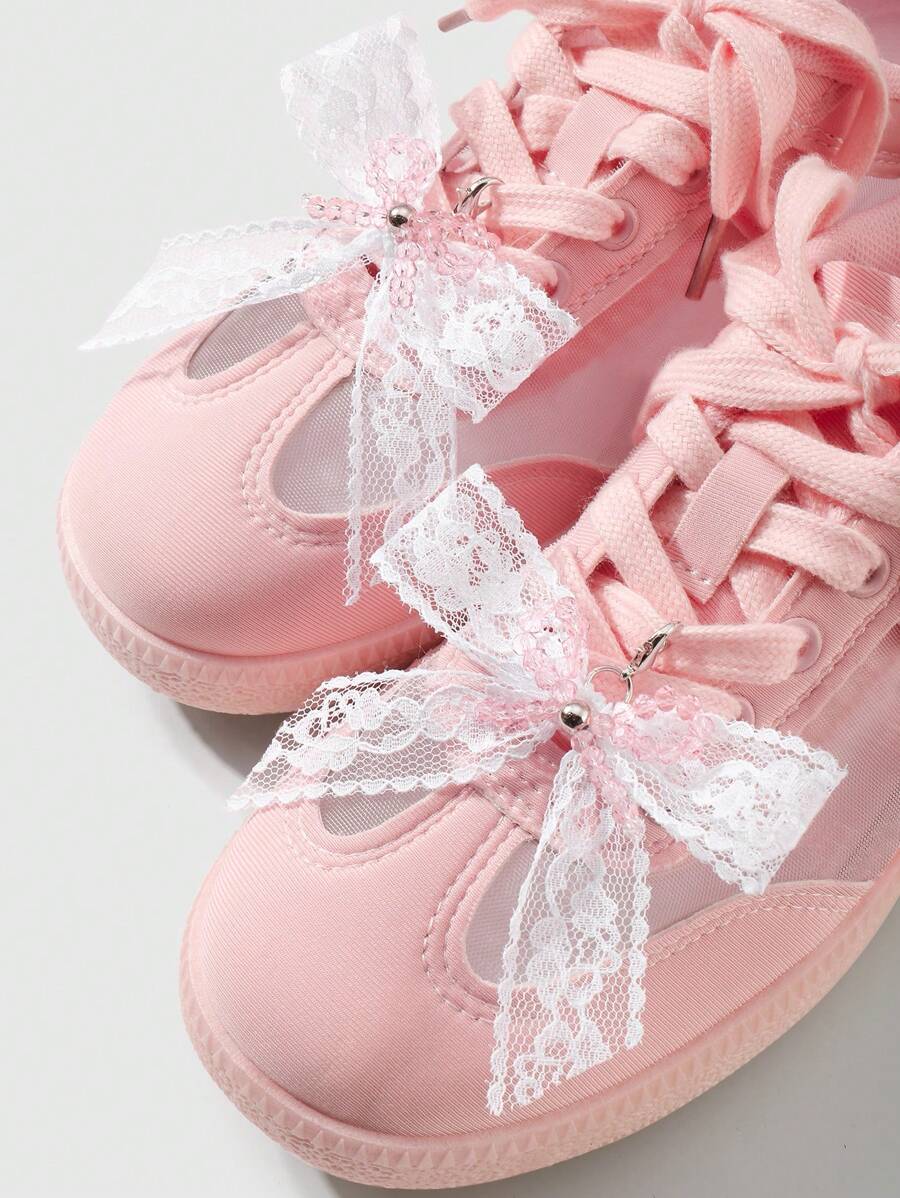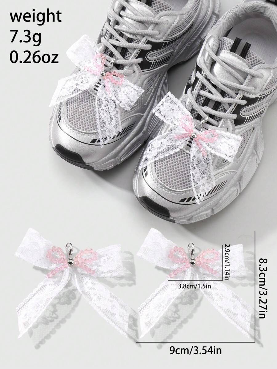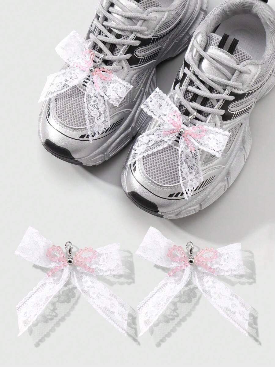 Kawaii 2pcs/Set Elegant Handmade Beaded Pink Crystal-Like & White Lace Bow Shoe Clips, Fashionable Korean Style Versatile Decoration Suitable For Women, Great As Daily Wear Or Gift