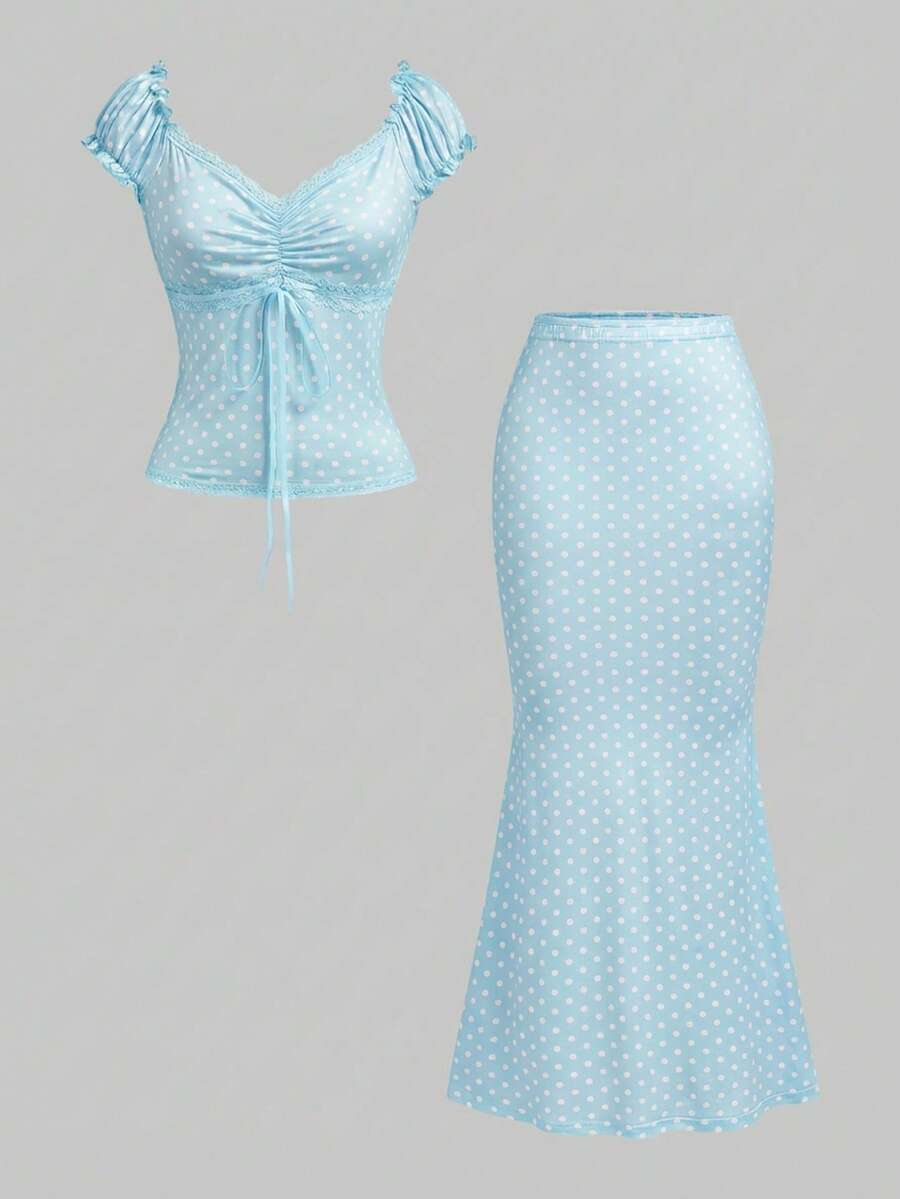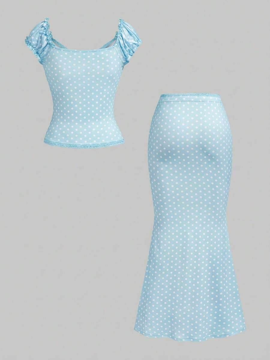Kawaii 2pcs/Set Women's Summer Outfits, V-Neck Bowknot Decor Contrast Polka Dot Lace Patchwork Slim Fit Top And Skirt