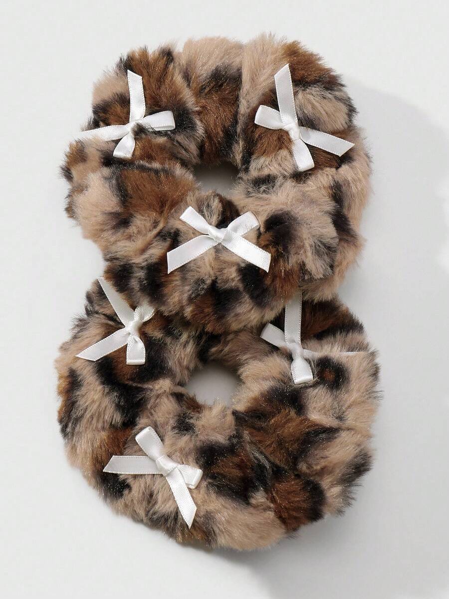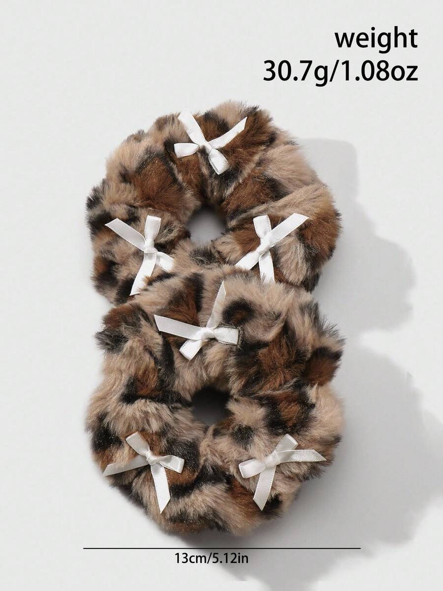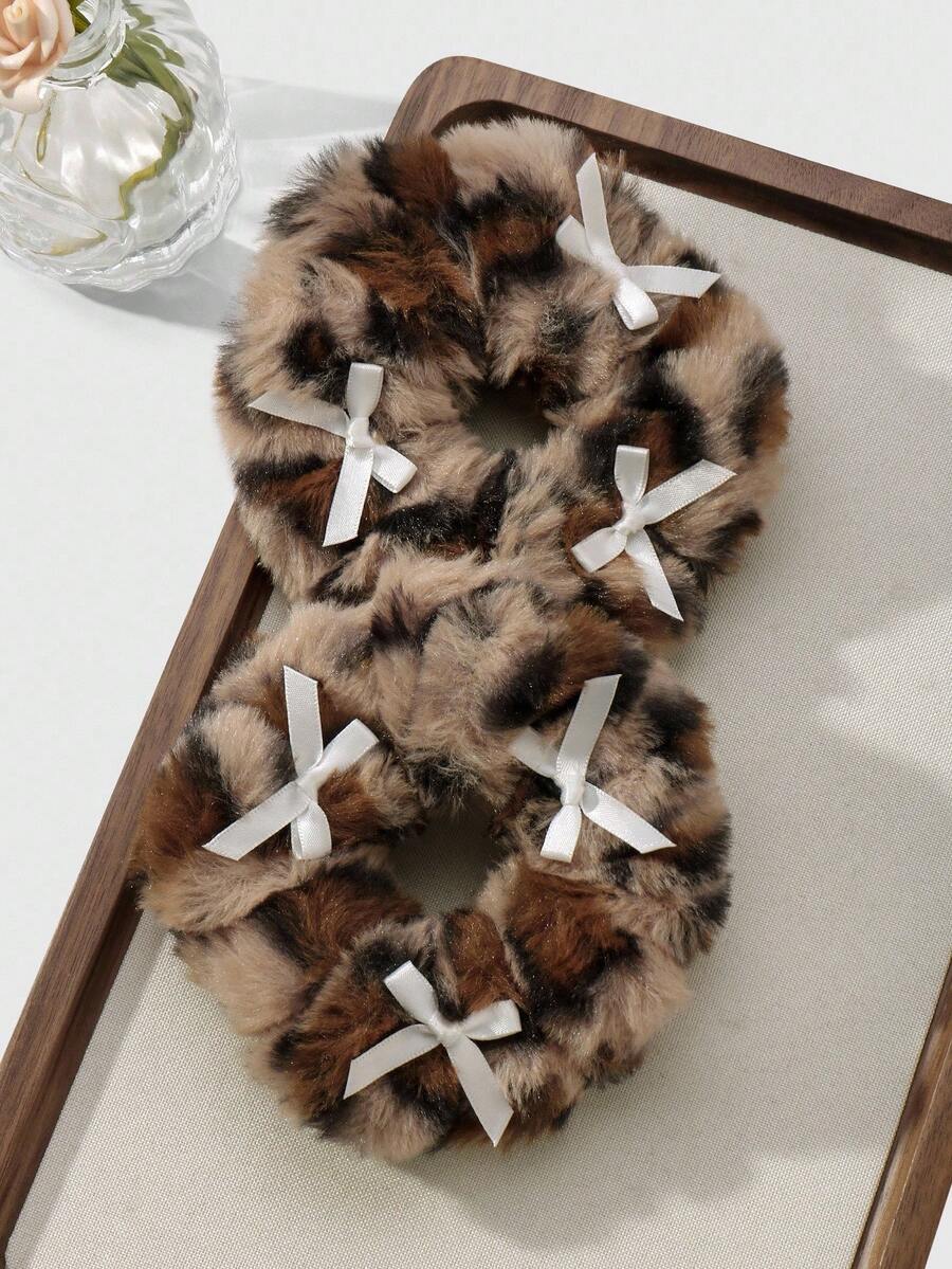 Kawaii 2pcs Y2K Retro Chic Leopard Print Fluffy Scrunchies With White Ribbon Bow, Combination Set Suitable For Women/Girls Daily Wear, Holiday Gift