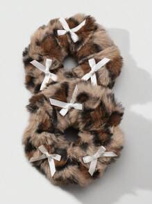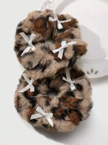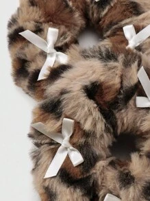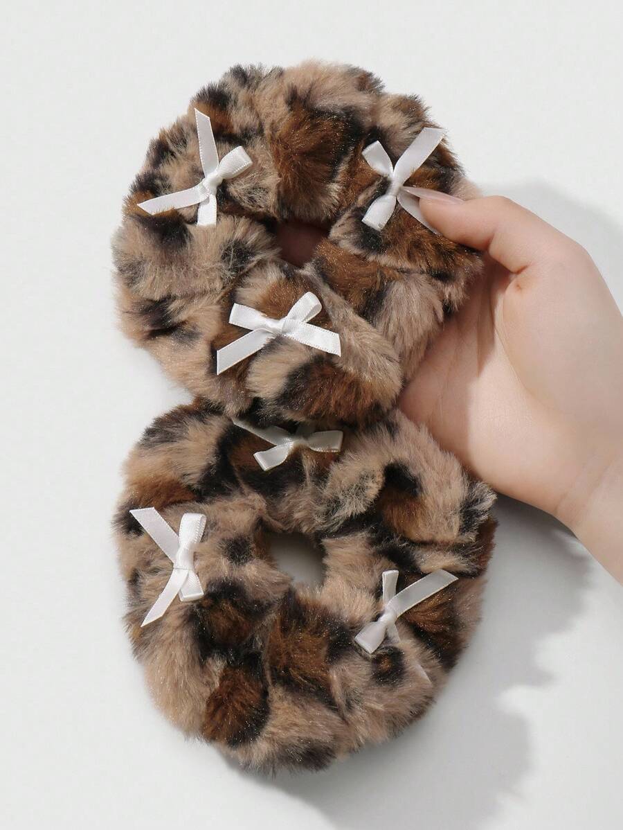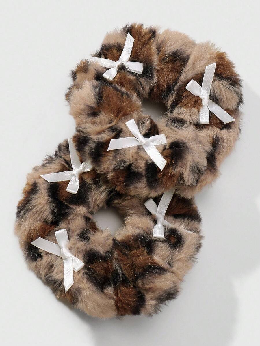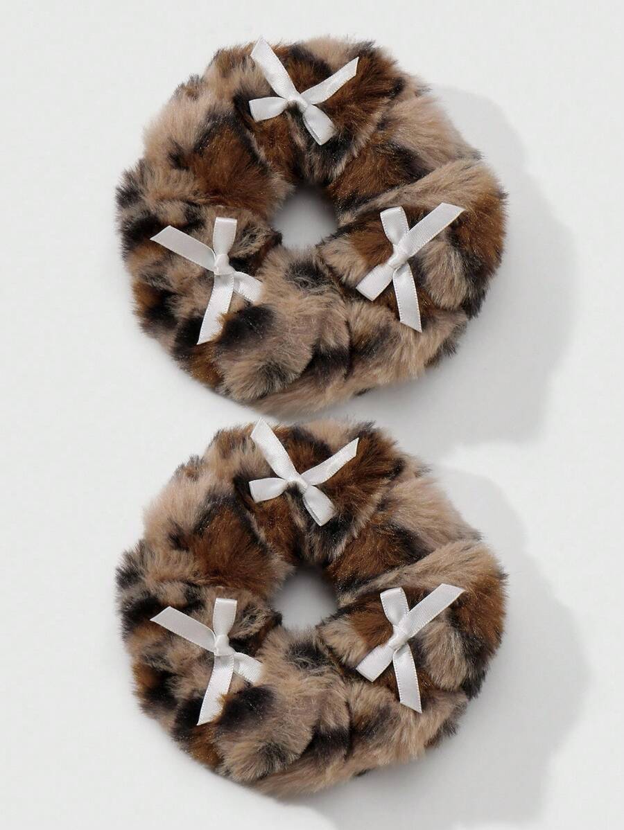 Kawaii 2pcs Y2K Retro Chic Leopard Print Fluffy Scrunchies With White Ribbon Bow, Combination Set Suitable For Women/Girls Daily Wear, Holiday Gift