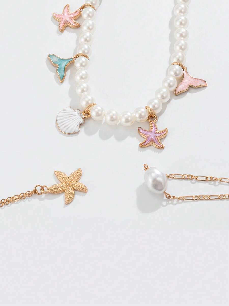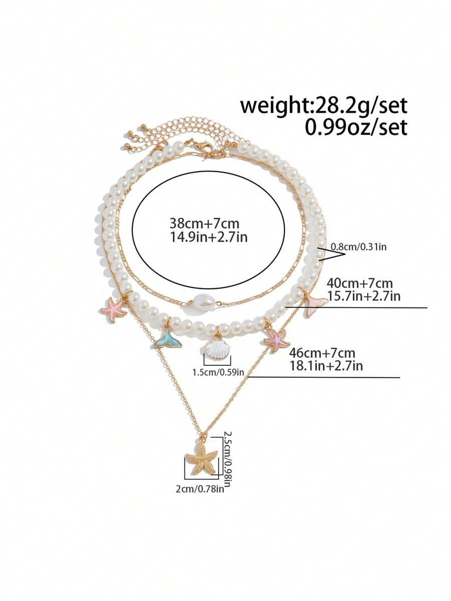 Kawaii 3pcs Fashionable Minimalist Hippie Shell, Starfish & Pearl Pendant Necklace Set, Women Summer Beach Party Jewelry
