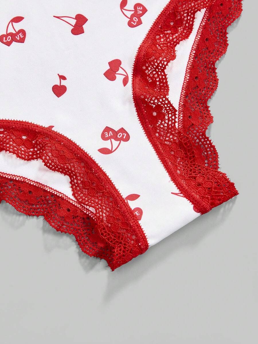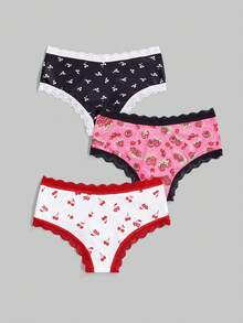 Kawaii 3pcs/Set Women's Strawberry Print Lace Patchwork Underwear