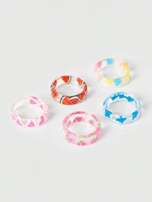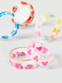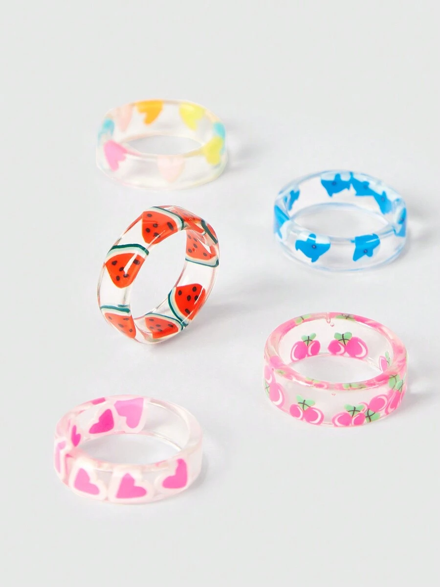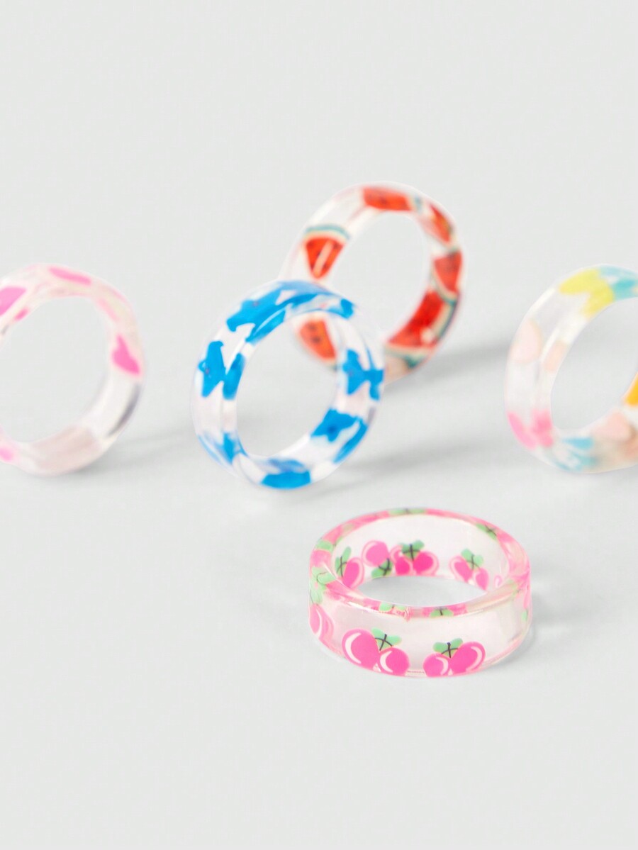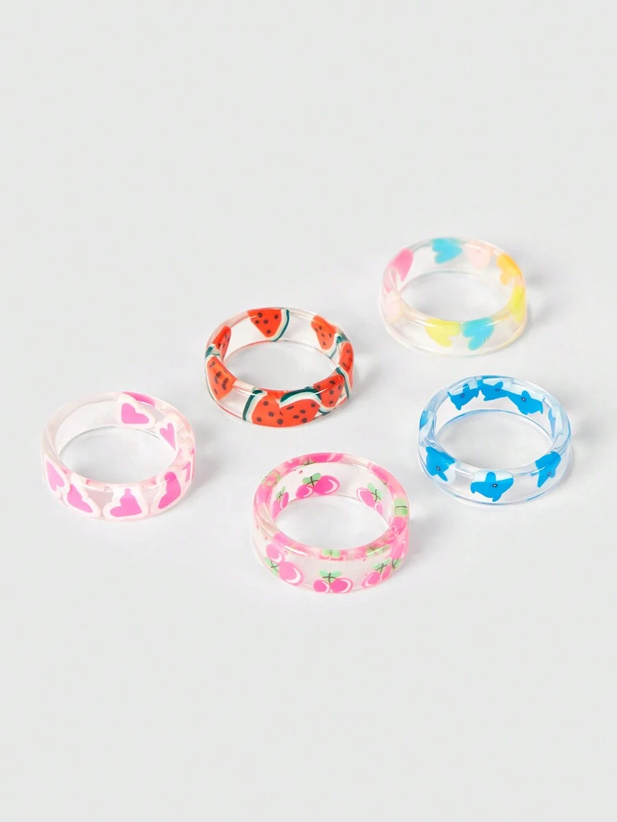 Kawaii 5pcs/Set Creative & Personalized Fruit Animal Resin Rings, Fresh Countryside Style, Colorful & Clear, Fashionable Women Rings