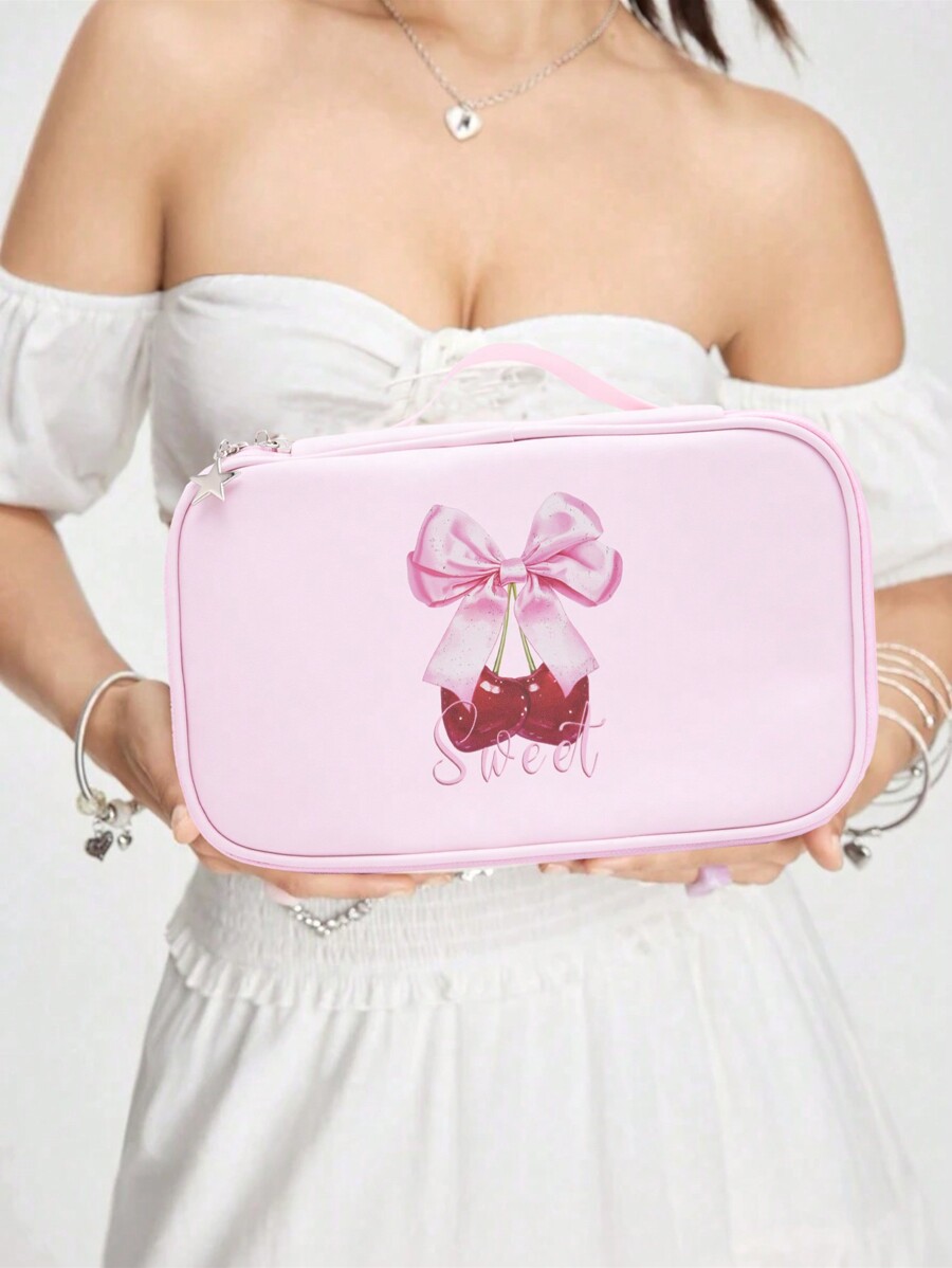 Kawaii 876919 Cute Pink Bow & Cherry Print Large Capacity Portable Makeup Bag For Women