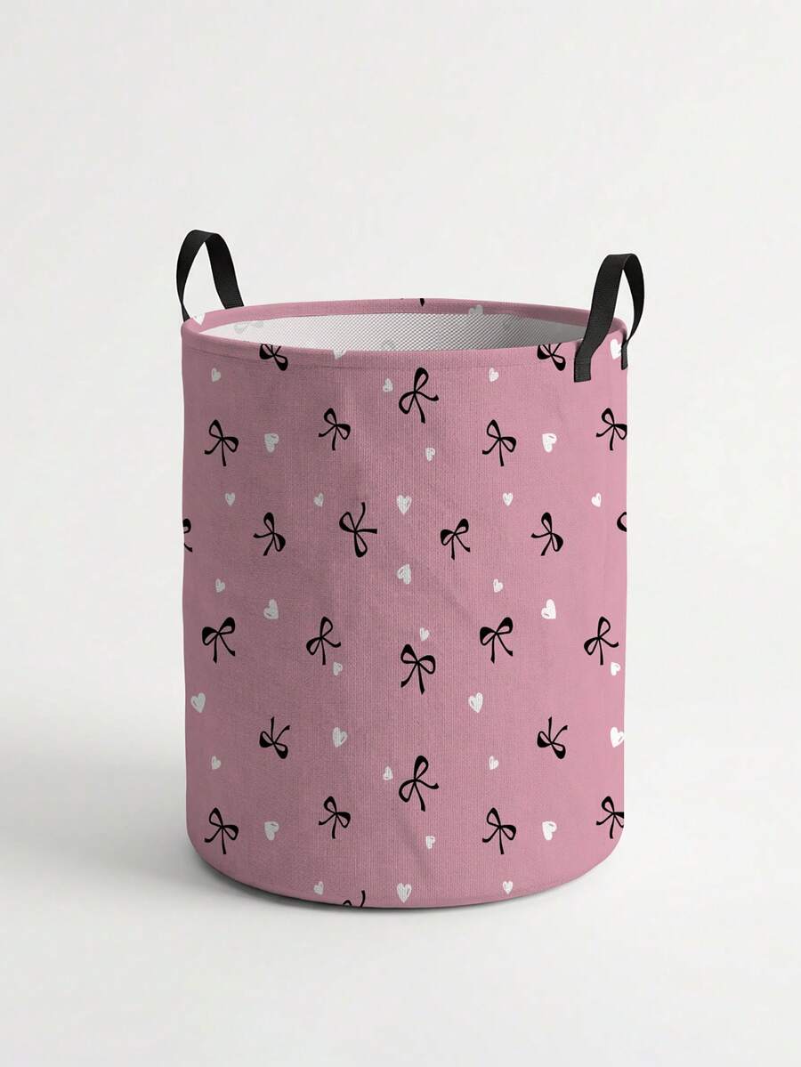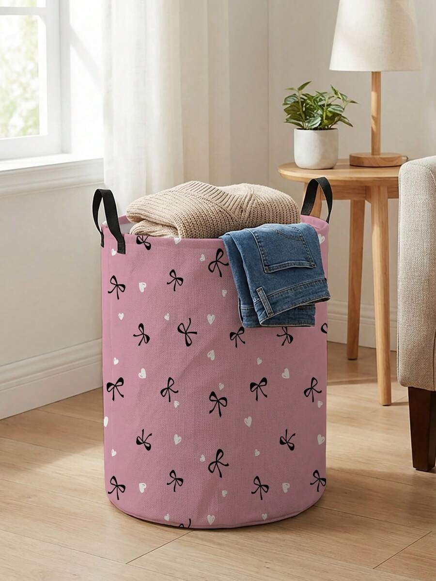 Kawaii Black And Pink Bow Heart-Shaped Pattern Printed Circular Storage Box, Suitable For Storing Clothes And Books, Convenient For Laundry Baskets