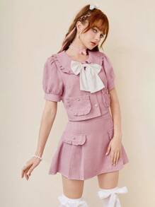 Kawaii Bow Front Puff Sleeve Jacket & Pleated Skirt
