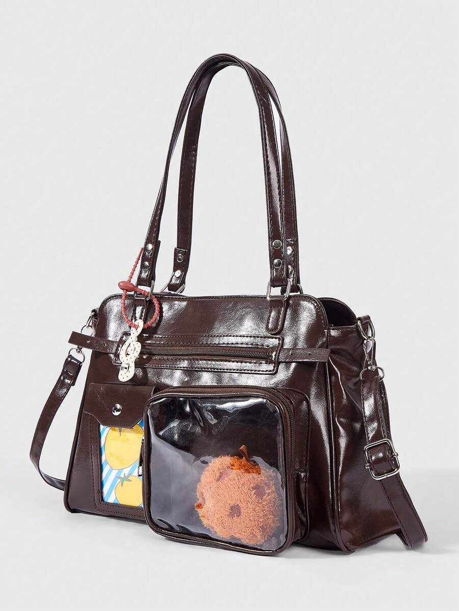 Kawaii Brown Double Pocket Lace Bow Cookies Crossbody Bag