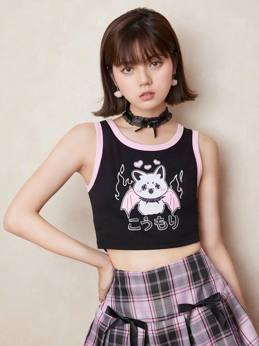 Kawaii Cartoon & Letter Graphic Contrast Binding Tank Top