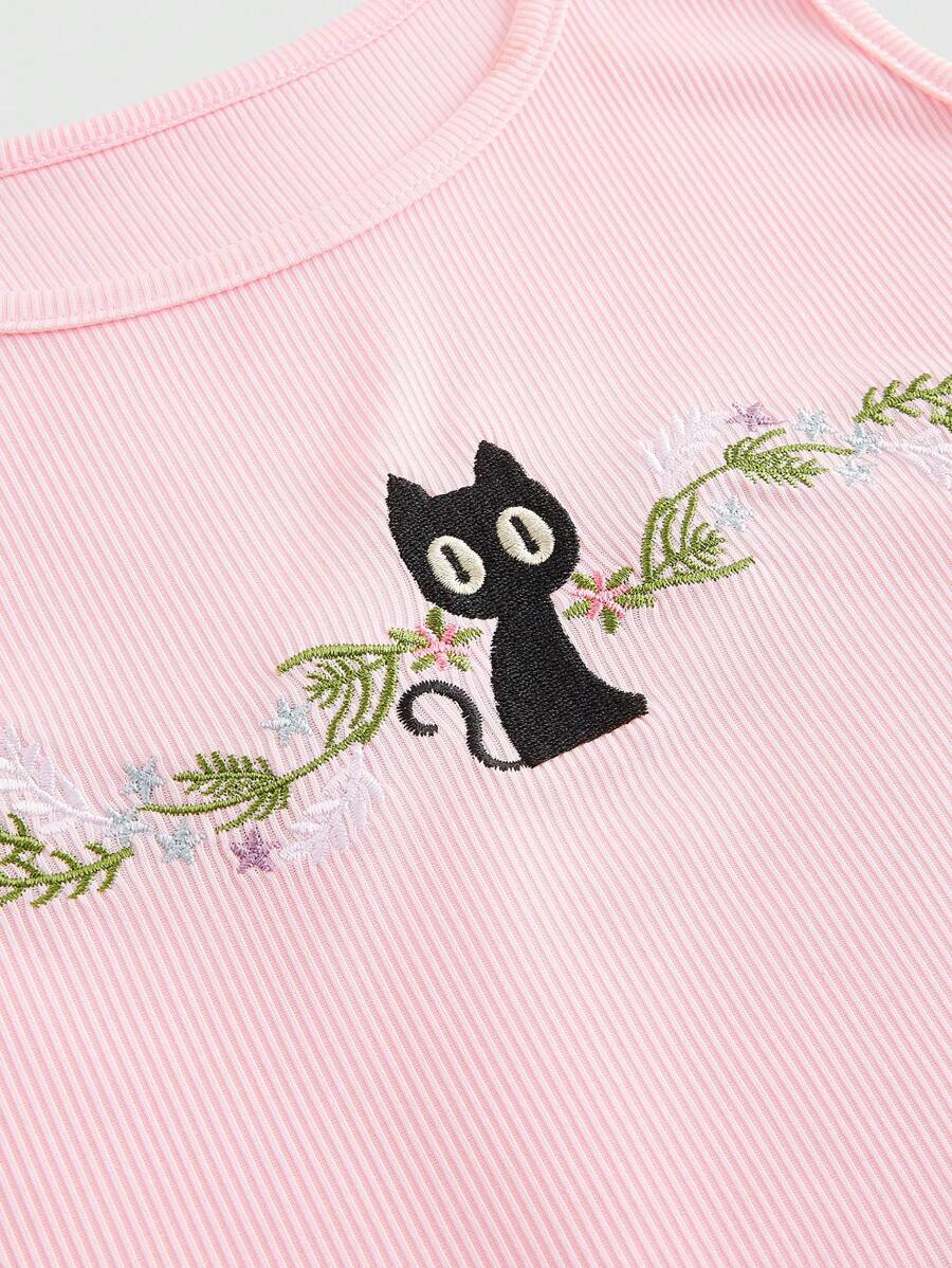 Kawaii Cat Embroidered Round Neck Vest And Plaid Printed Drawstring Long Pants Casual Pajama Set, School
