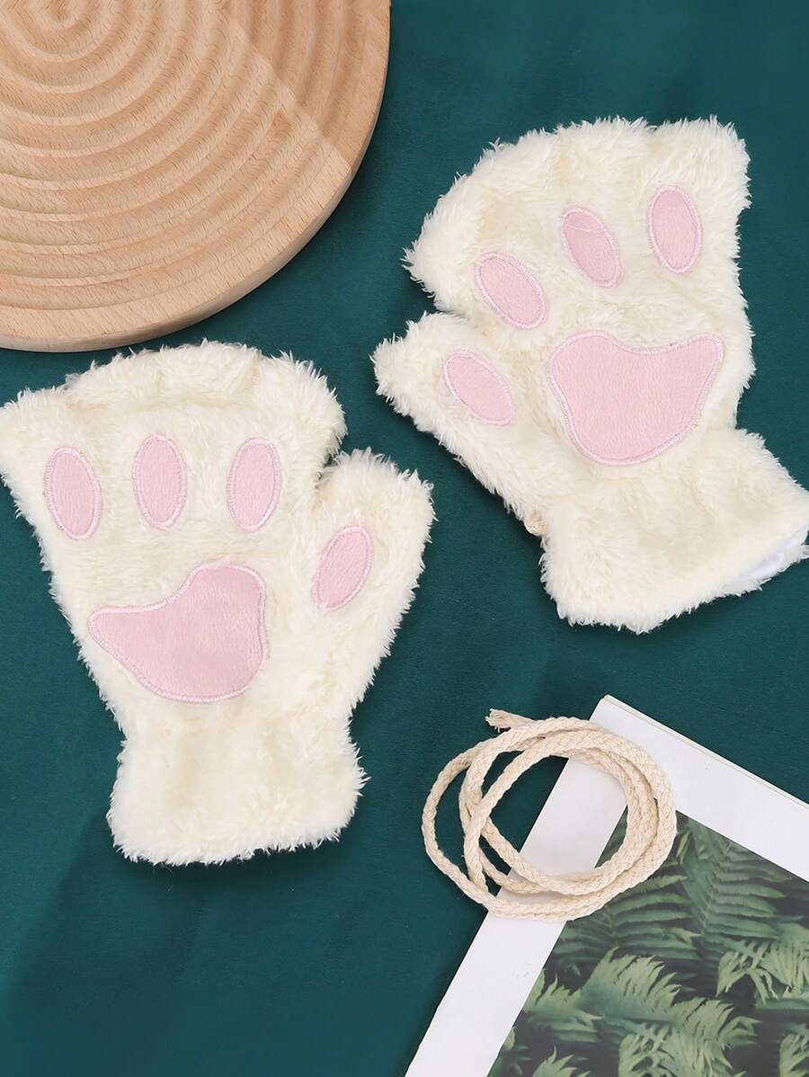Kawaii Cat Paw Design Fuzzy Fingerless Gloves