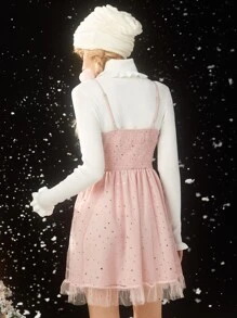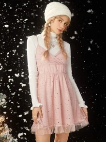 Kawaii Christmas Star Print Contrast Mesh Shirred Cami Dress Without Top