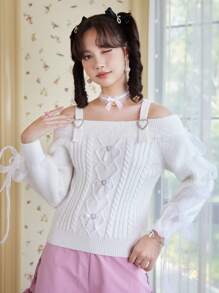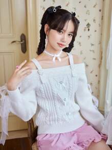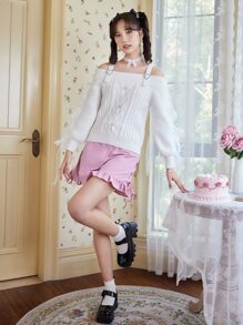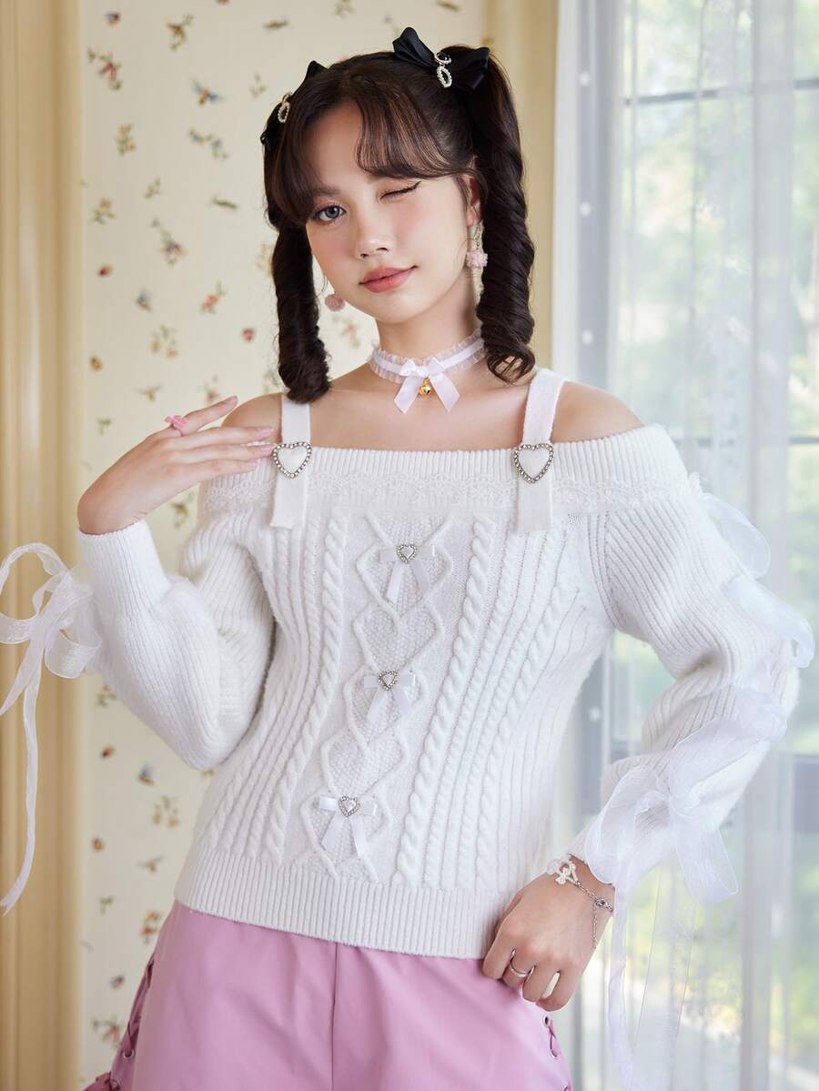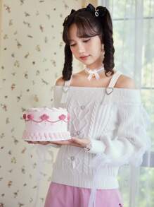 Kawaii Contrast Lace Cable Knit Cold Shoulder Sweater