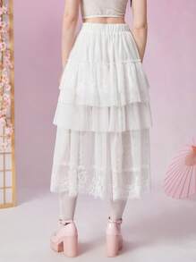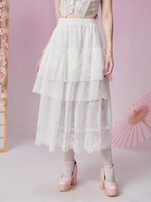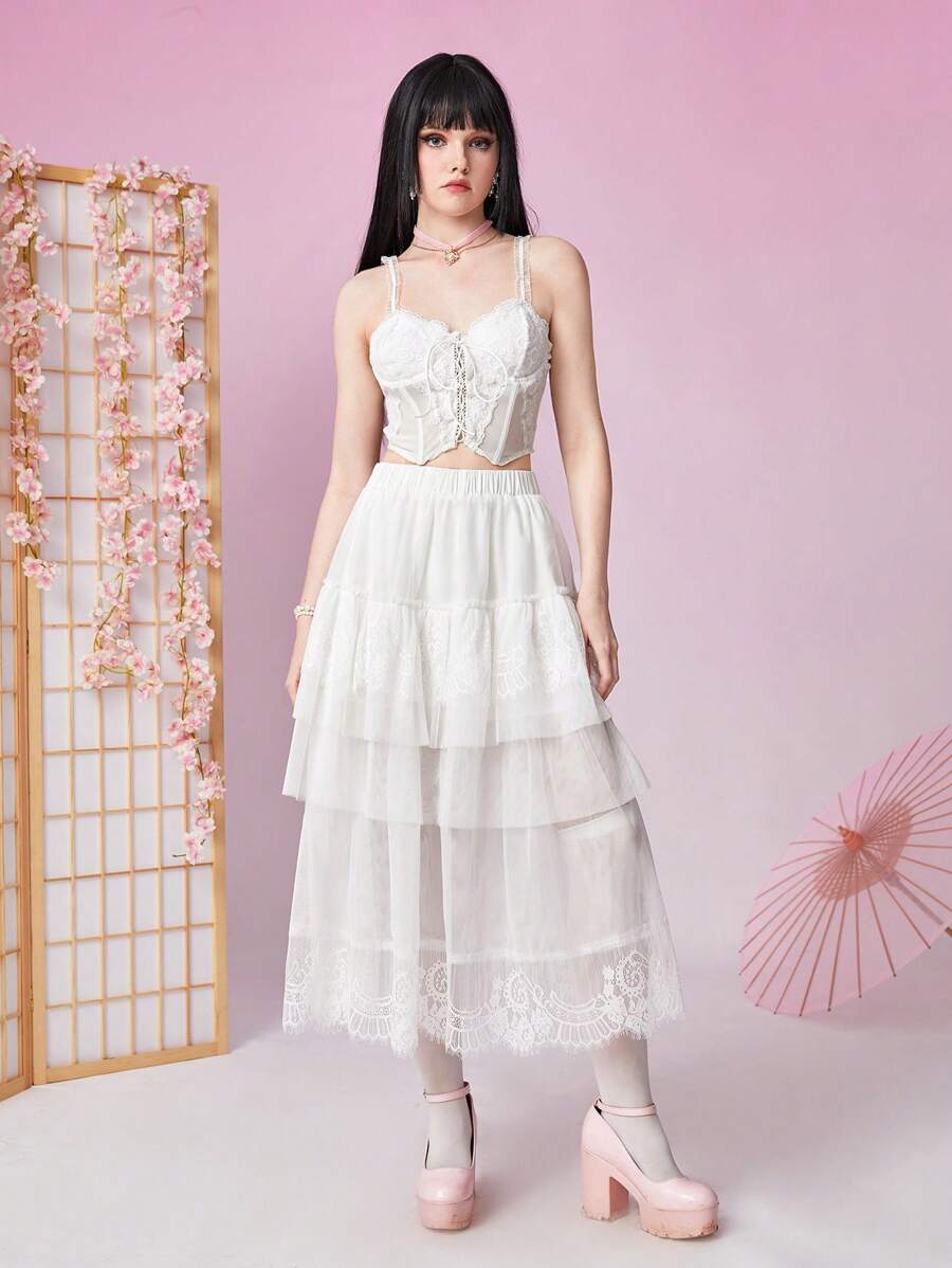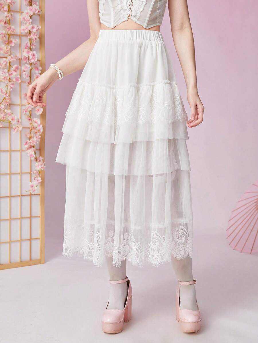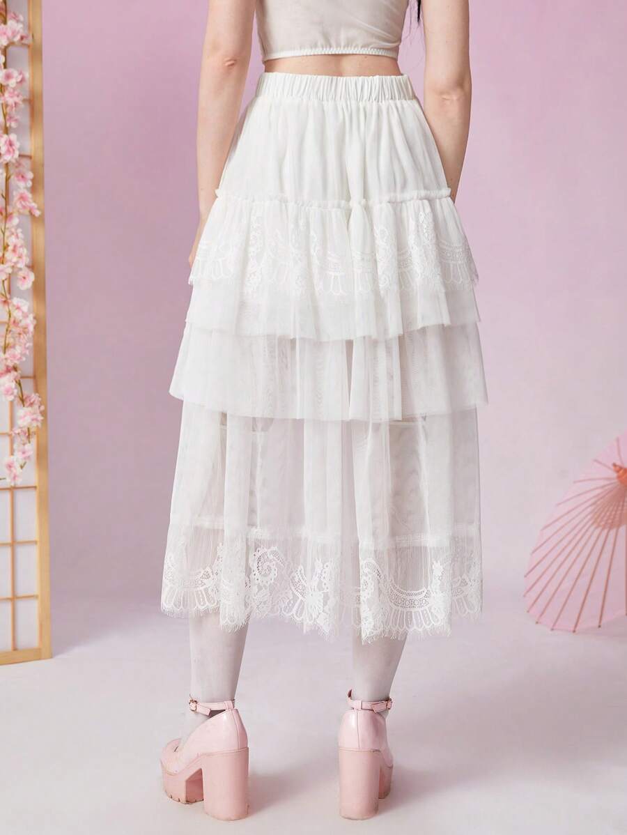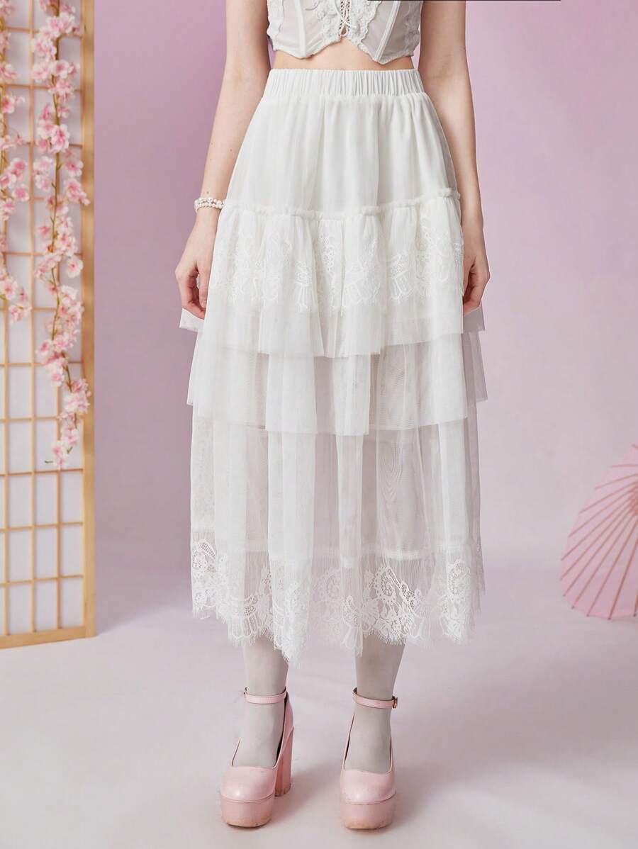 Kawaii Contrast Lace Layer Hem Mesh Skirt