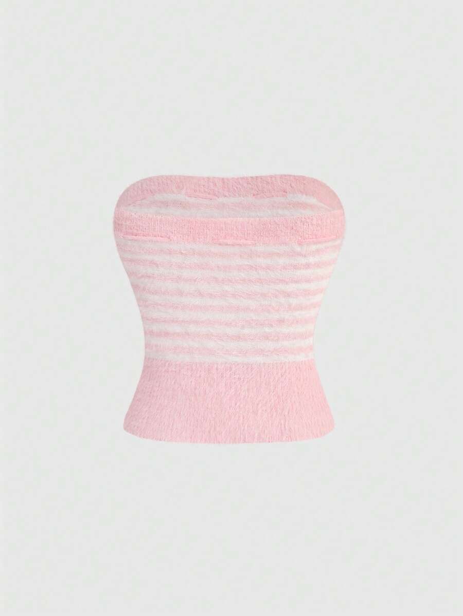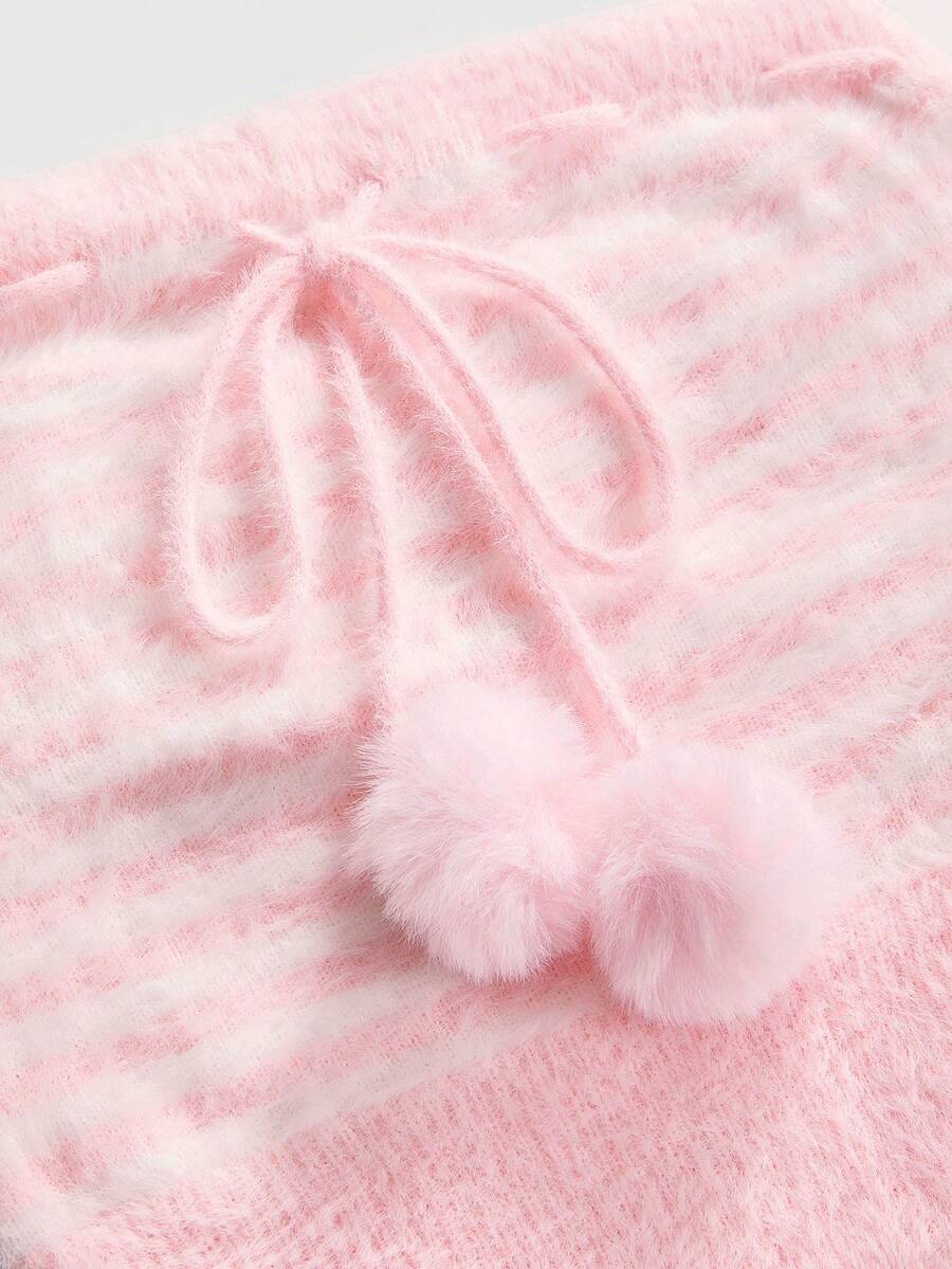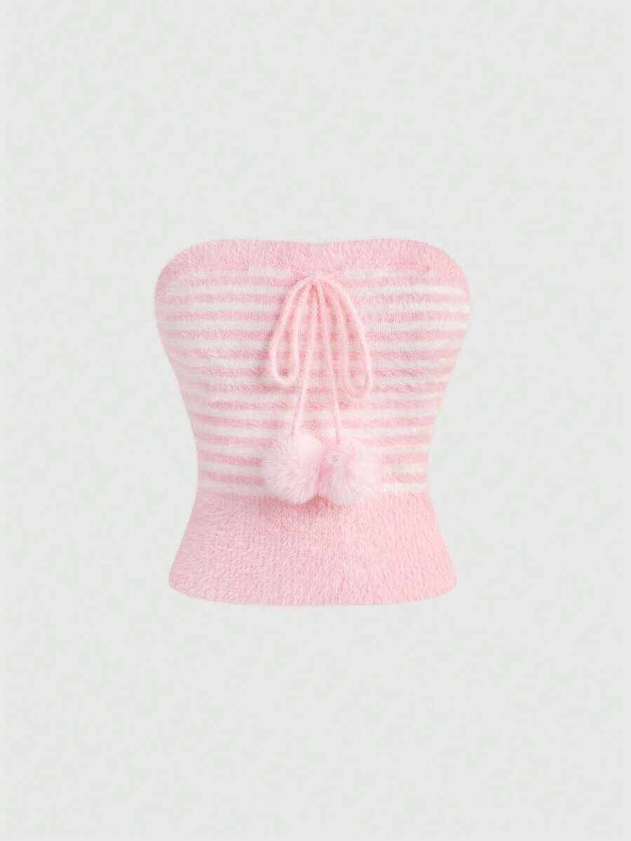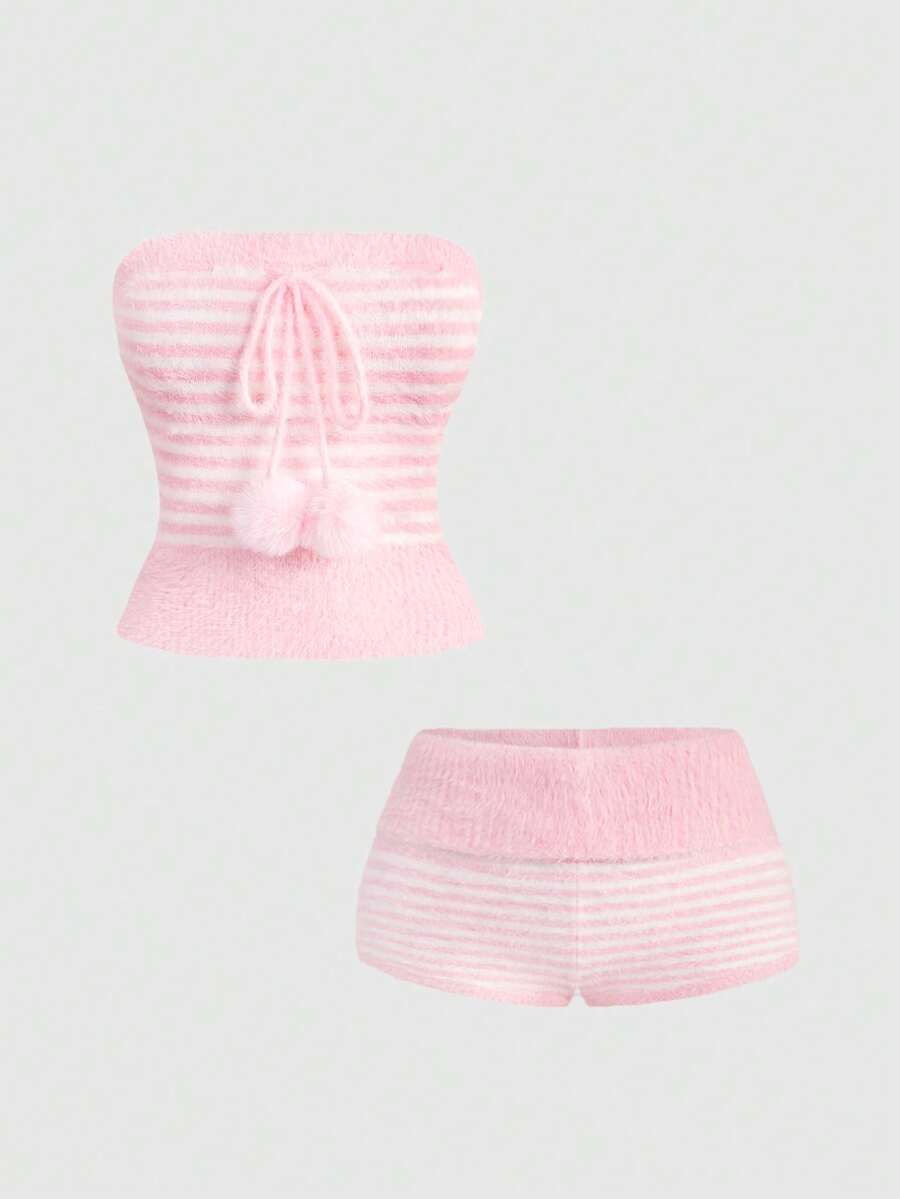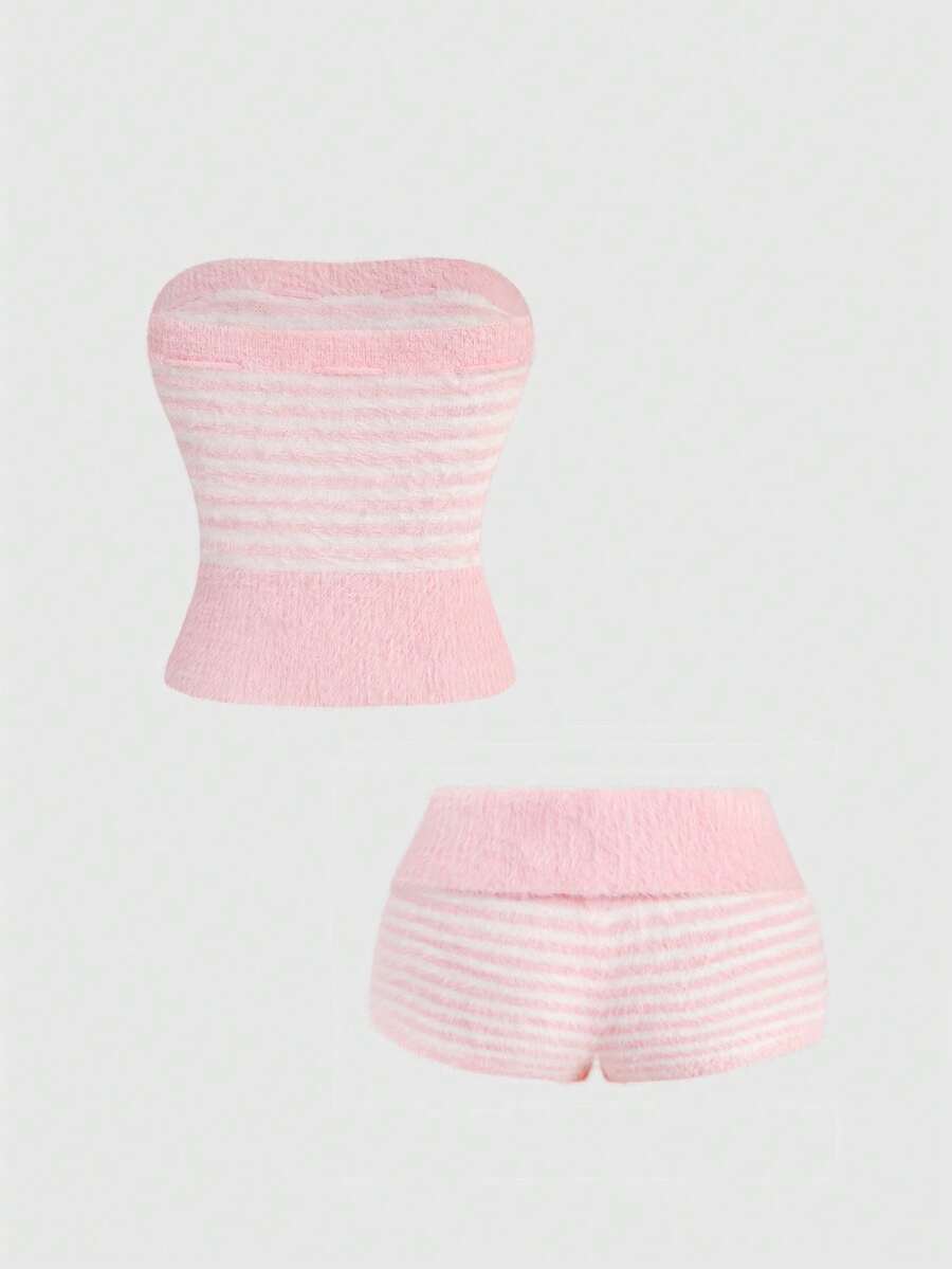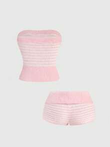 Kawaii Coquette Cute & Innocent Girl Striped Tube Top And Shorts 2 Pieces Knit Sweater Set