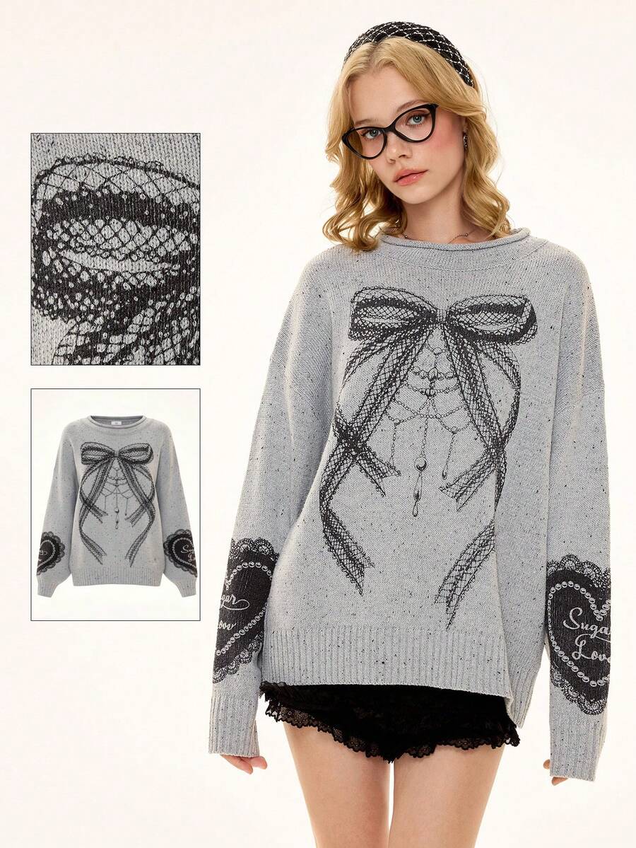 Kawaii Cute Bow Lace Jacquard Sweater, Sweet & Charming
