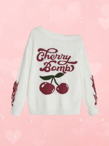 Kawaii Cute Girl's Cherry Slogan Intarsia Sleeve With Bowknot Accent Asymmetric Neck Plus Size Knit Pullover Sweater
