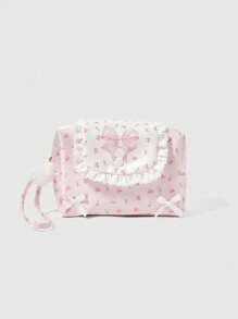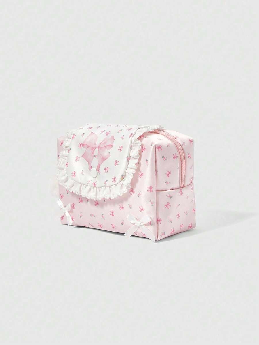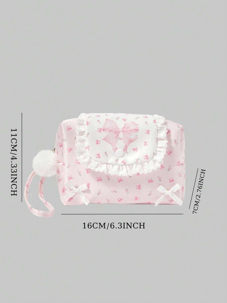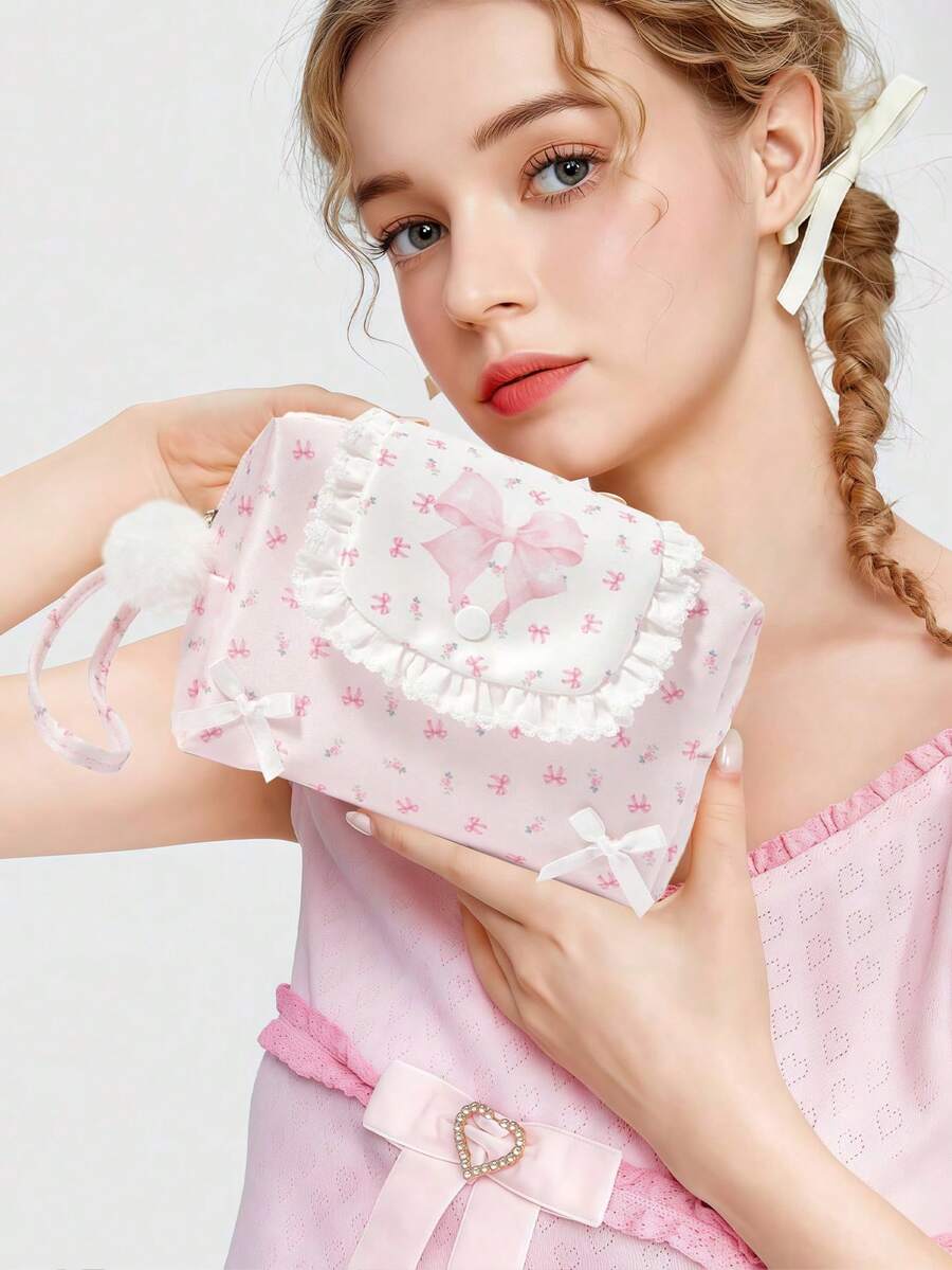 Kawaii Cute Girls Heart-Shaped White Lace & Pink Bow Design Large Capacity Portable Cosmetic Bag, Item No: 401422/412463
