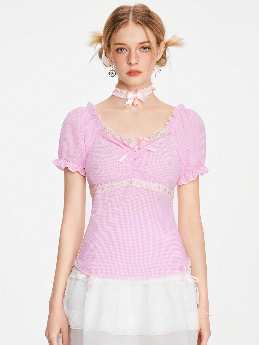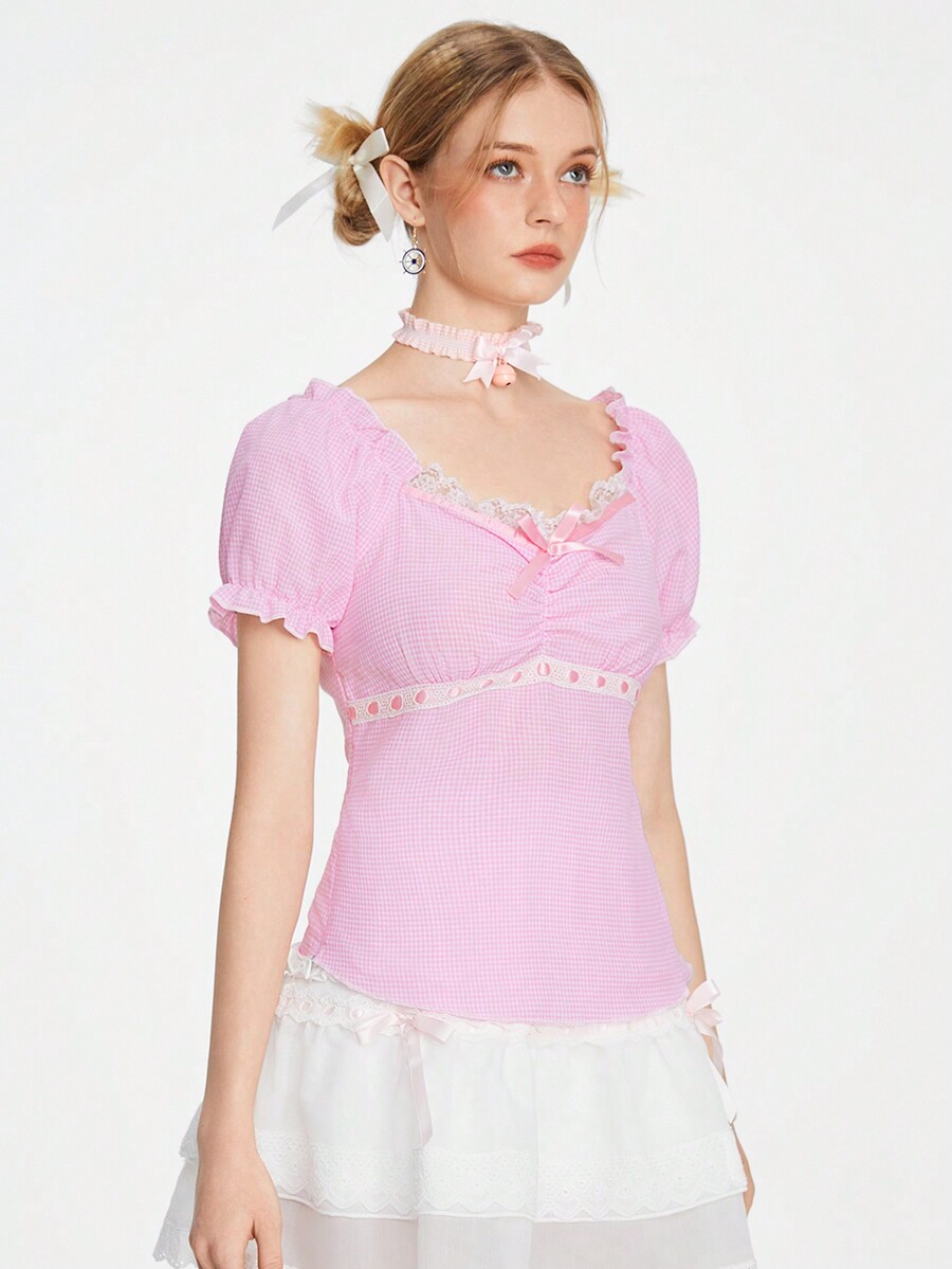 Kawaii Cute Gyaru Style Plaid Ruffled Puff Sleeve Women Short Sleeve Blouse