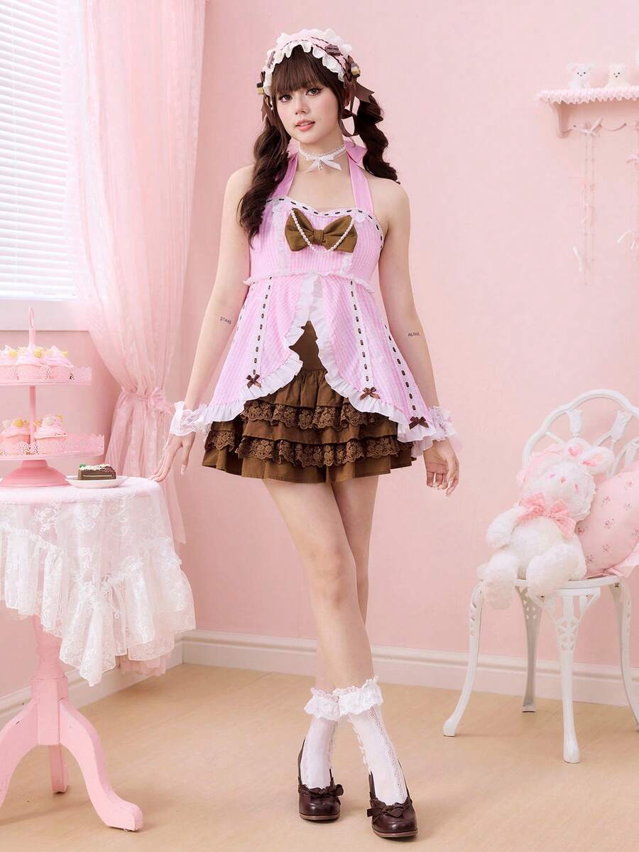 Kawaii Cute Heart Tie-Neck Lace Patchwork Doll Dress Plaid Bow Decor Women Camisole