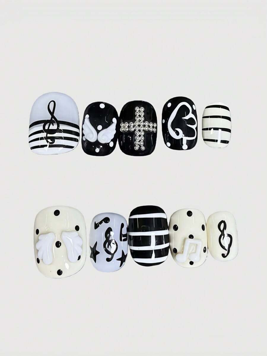 Kawaii Cute Lace Edged Romantic Heart Ballerina Style Bow White Wings Metal Music Note Pink Series Handmade False Nail Tips, Mass Produced Energetic Girl Wear, Suitable For Daily Outings And Dates