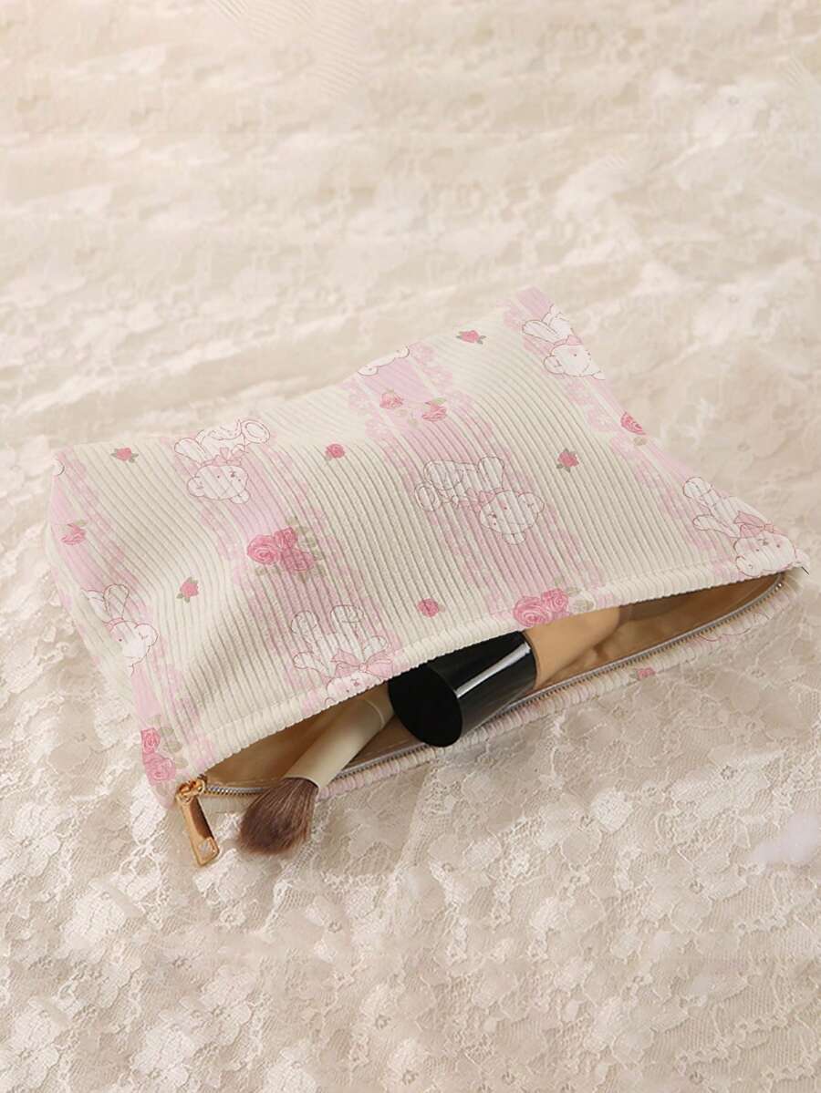 Kawaii Cute Pink Bow Teddy Bear Pattern Double-Sided Printed Corduroy Cosmetic Bag
