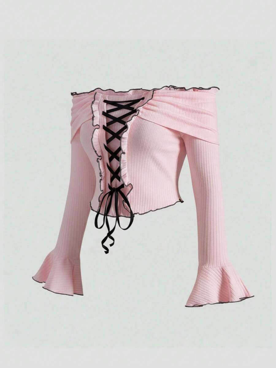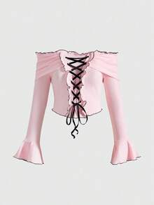 Kawaii Cute Pink Off Shoulder Tie-Up Contrast Color Blouse, Plus Size Pink Ladies Knit Sweater, Sweet Plus Size Women Autumn/Winter Daily Wear Top