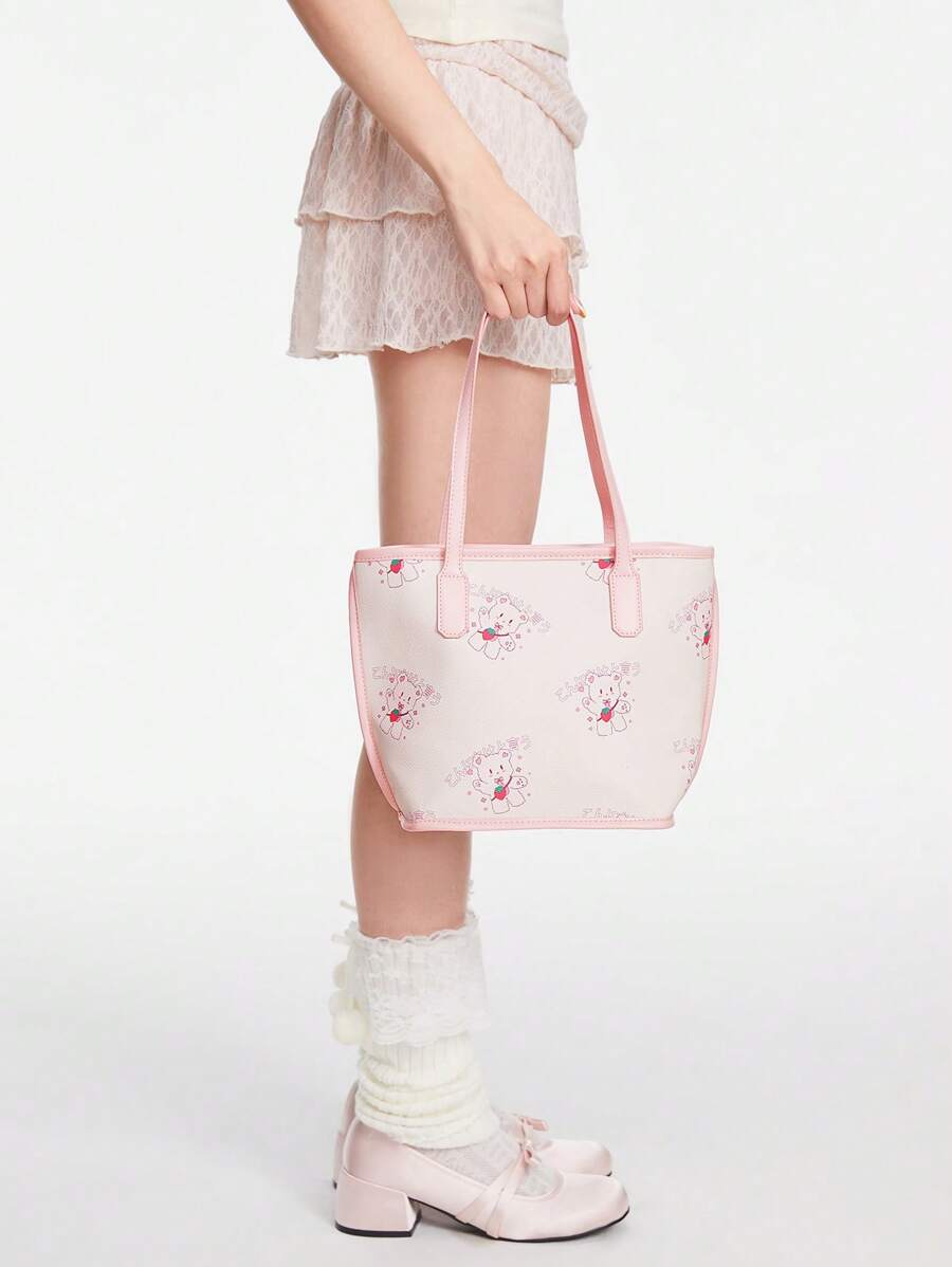 Kawaii Cute Strawberry Bear Printed Color-Block Basket Tote Bag With Shoulder Strap