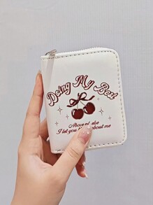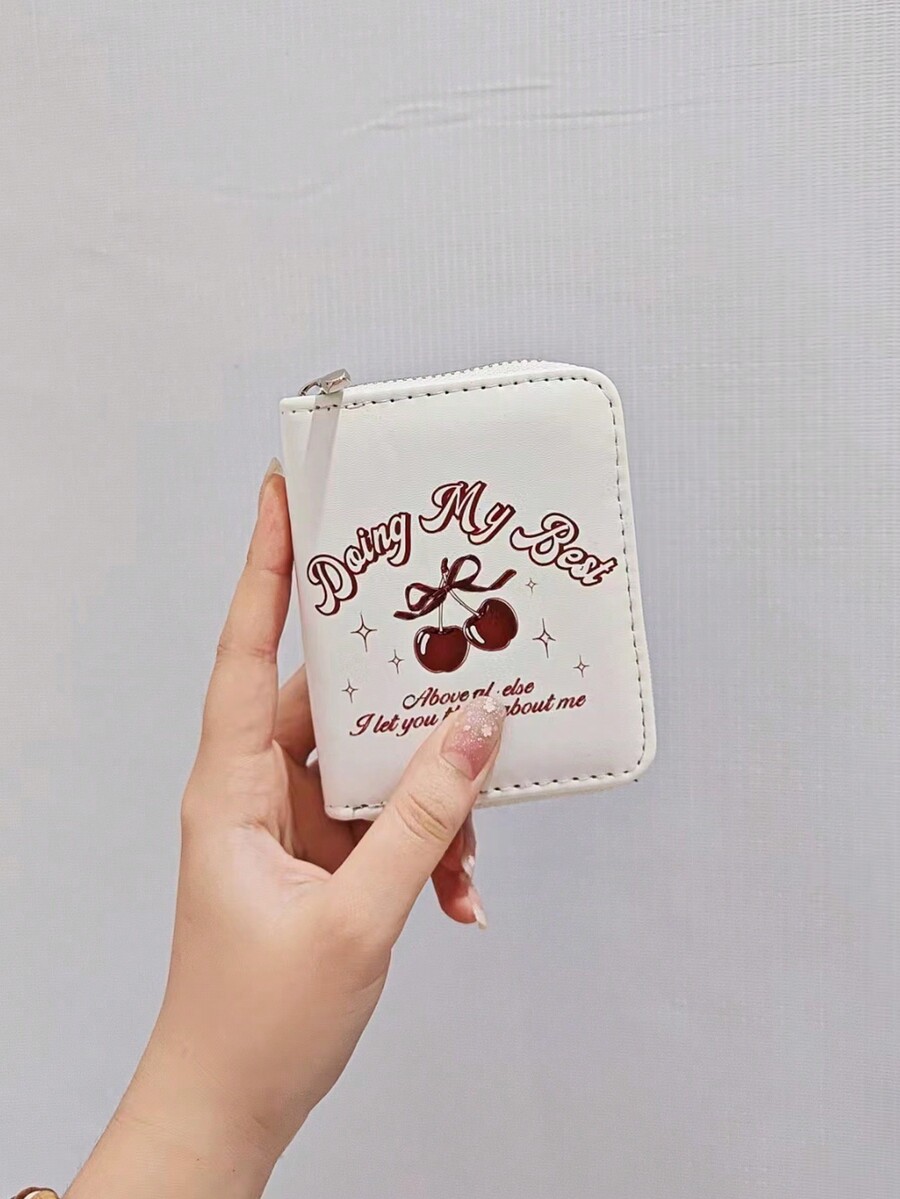 Kawaii Cute White Base Cherry Pattern Short Wallet, Multi-Functional Card Holder Wallet, 2 Pockets
