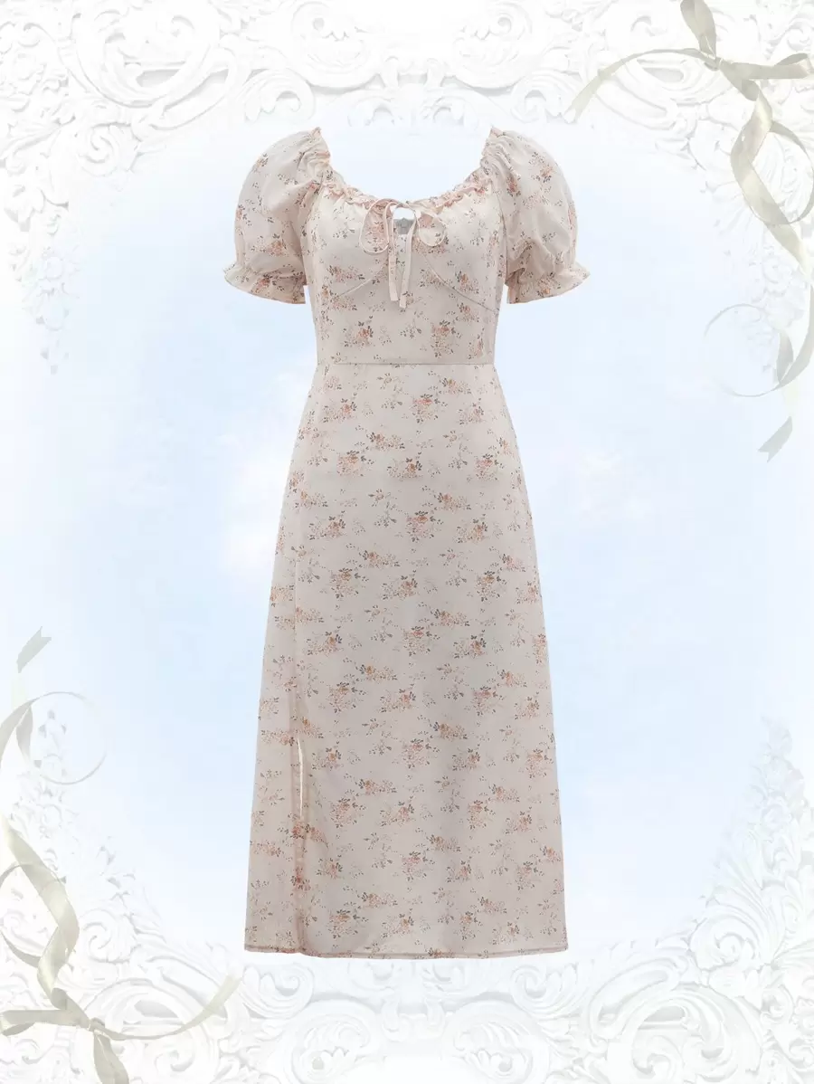 Kawaii Ditsy Floral Frill Knot Front Split Dress