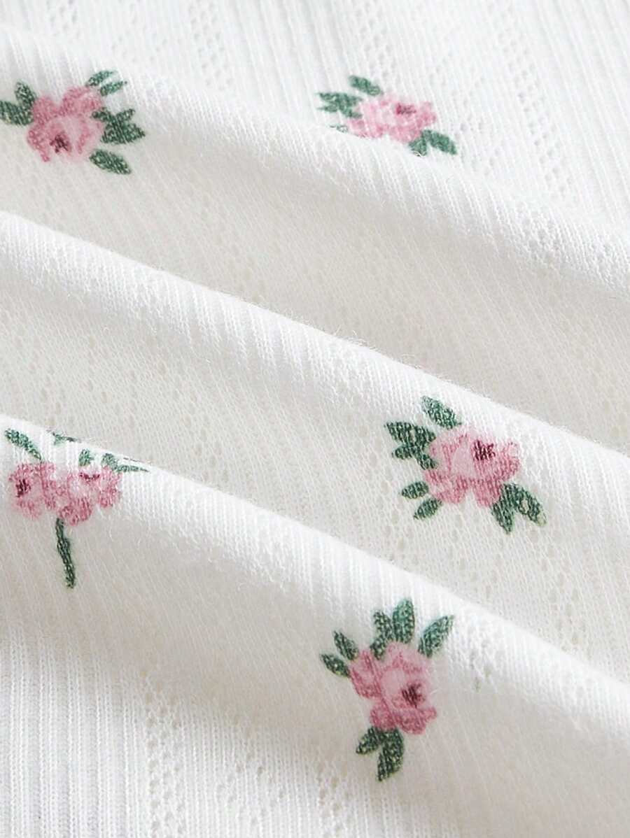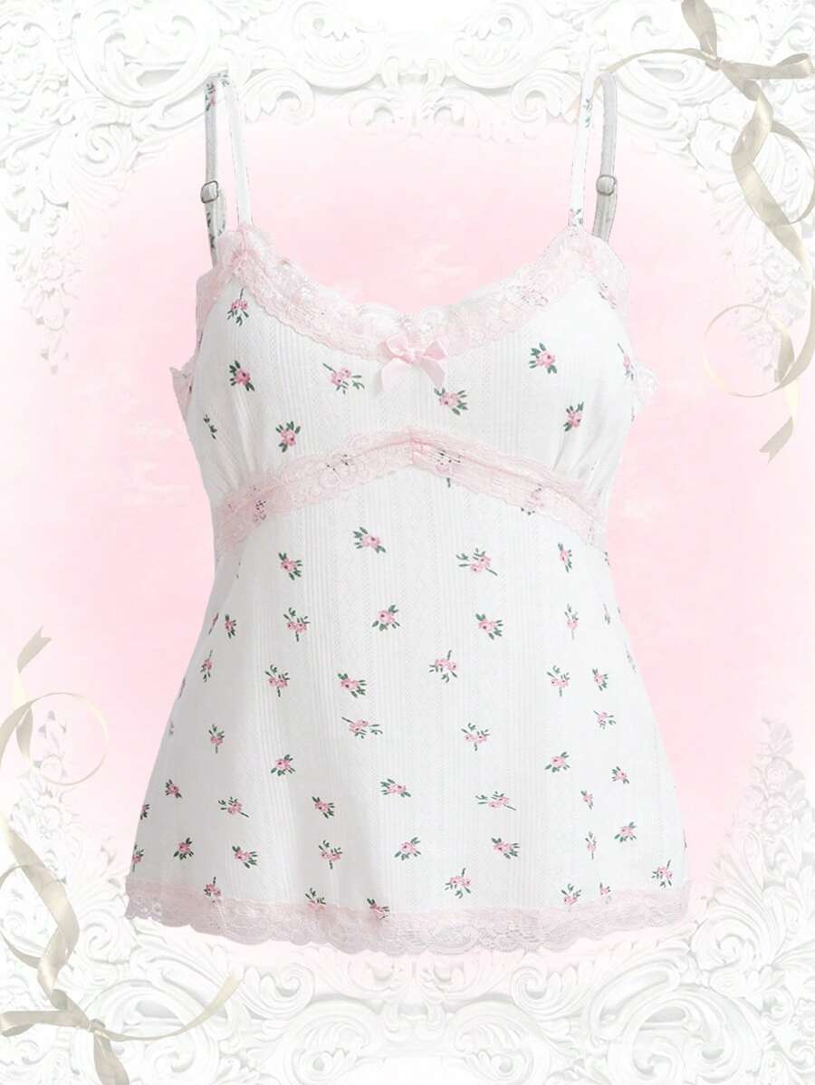 Kawaii Ditsy Floral Print Contrast Lace Cami Top, School