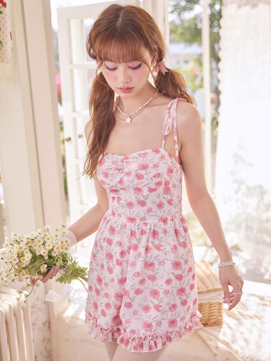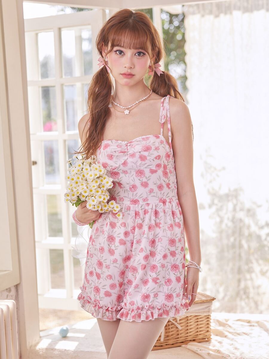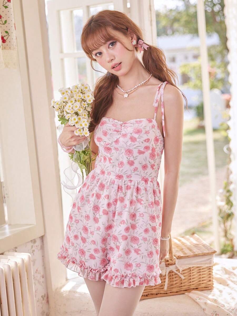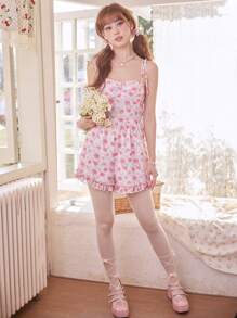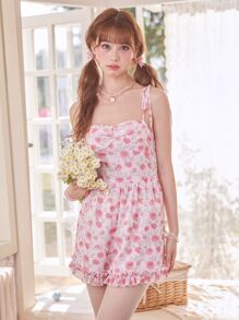 Kawaii Floral Print Tie Shoulder Ruffle Hem Cami Romper