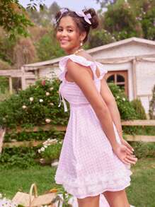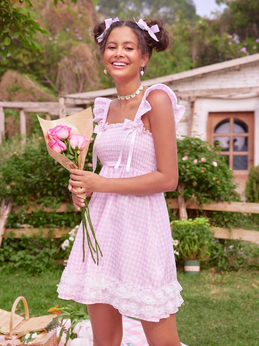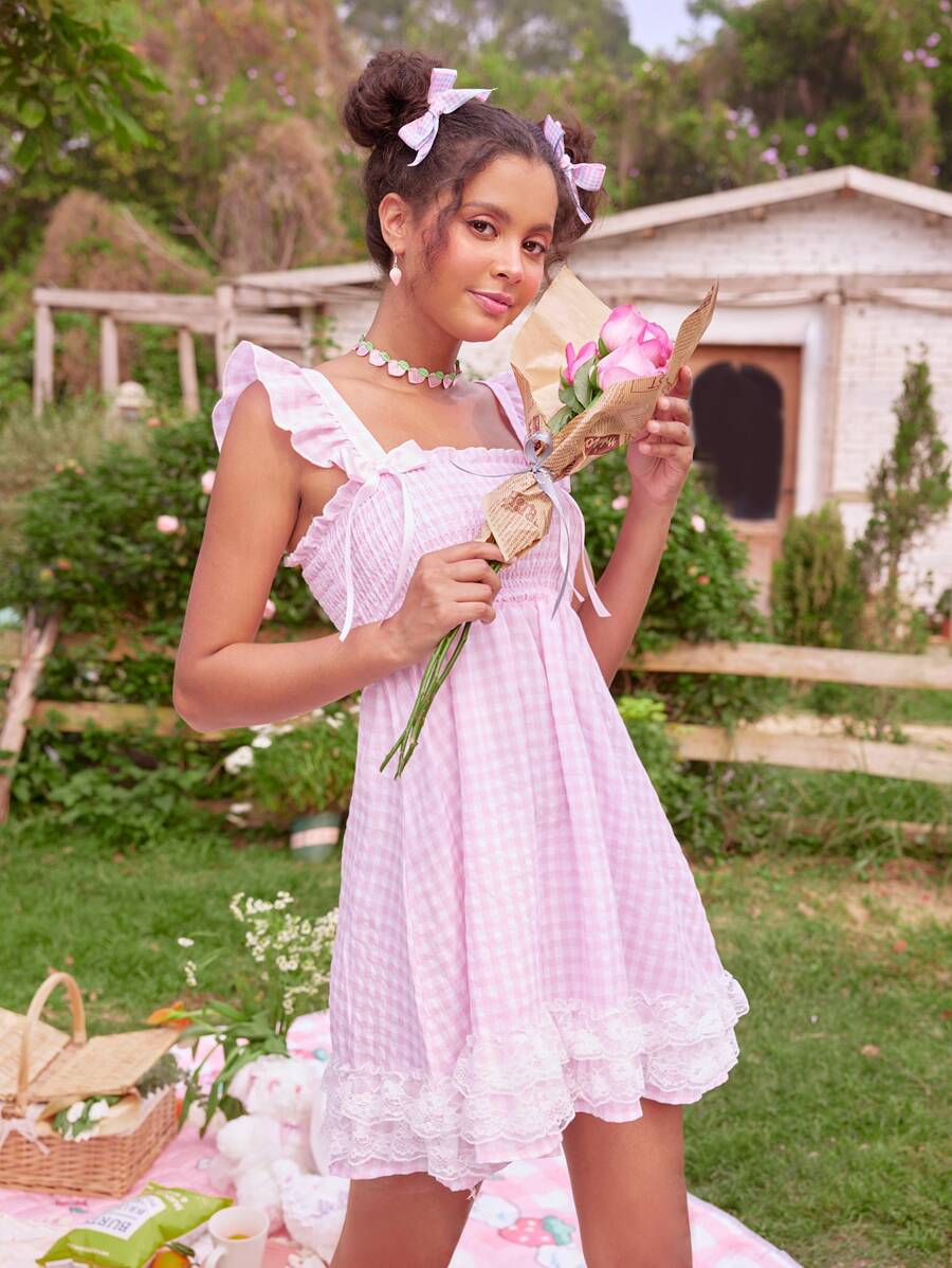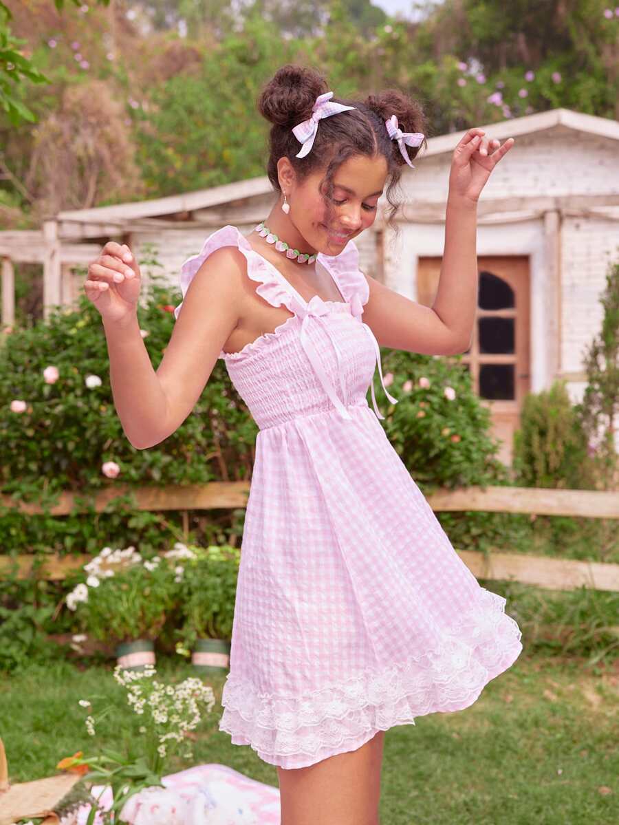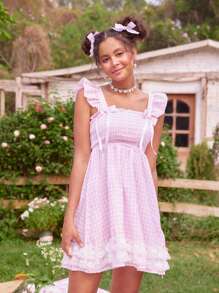 Kawaii Gingham Ruffle Trim Contrast Lace Shirred Dress