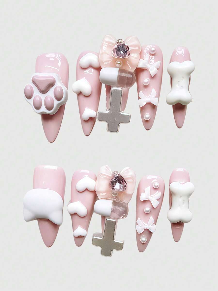 Kawaii Handmade Cute Pill-Shaped, Heart, Ballet, Bowknot, White Wings, Cross Decorated Artificial Nails In Pink Tones, Mass-Produced Energetic Girl's Daily Wear & Date Nails