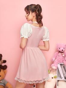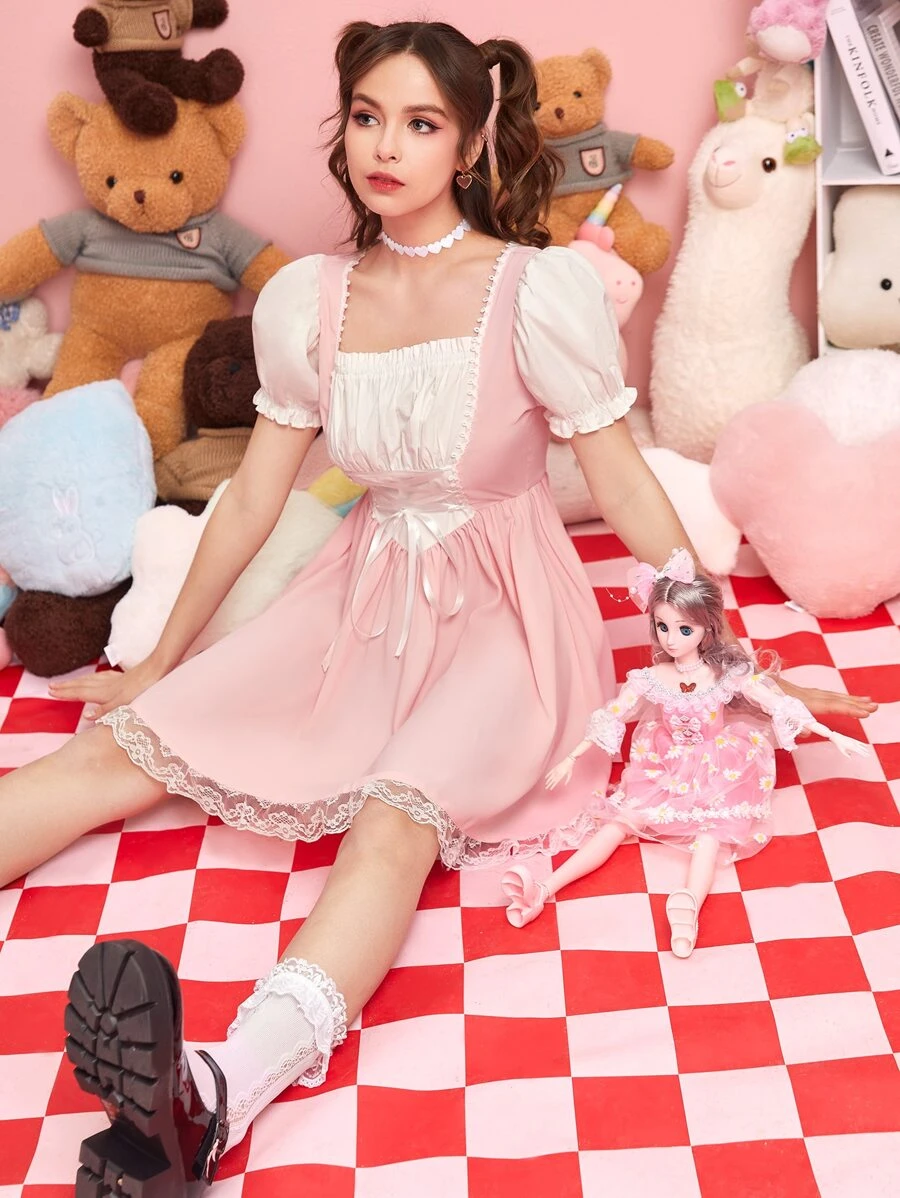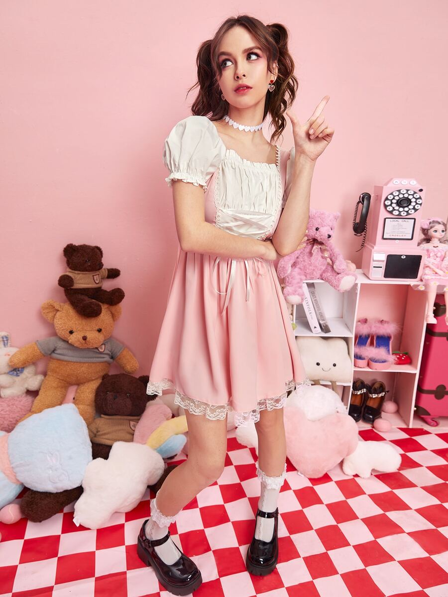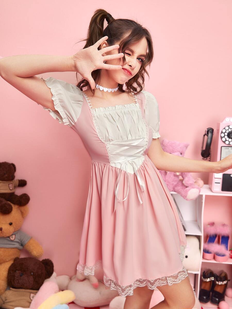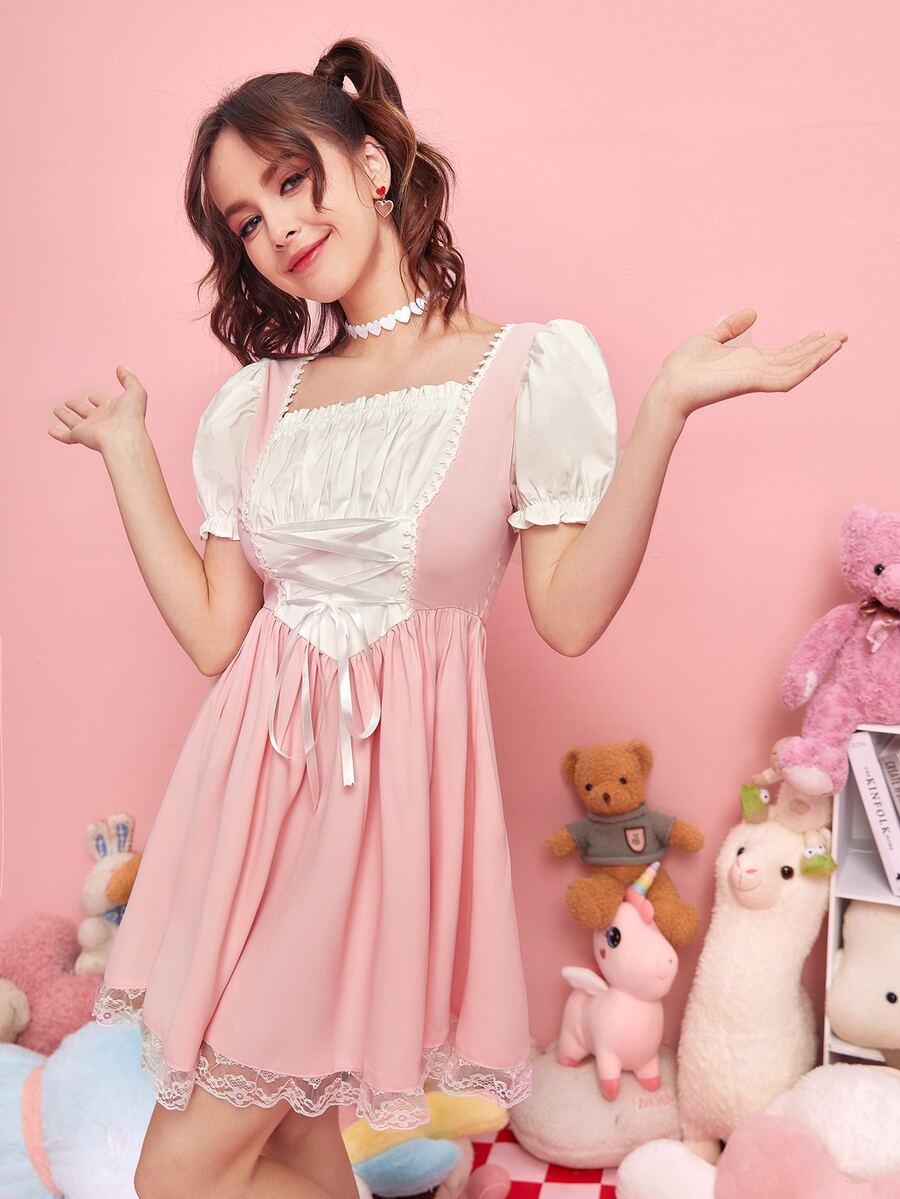Kawaii Lace Up Puff Sleeve Lace Up Dress