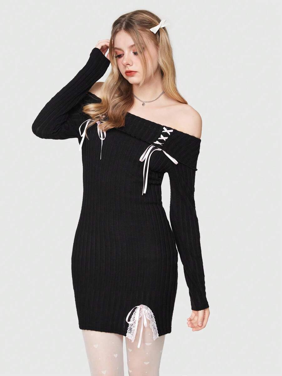 Kawaii Ladies' Off-shoulder Solid Color Dress