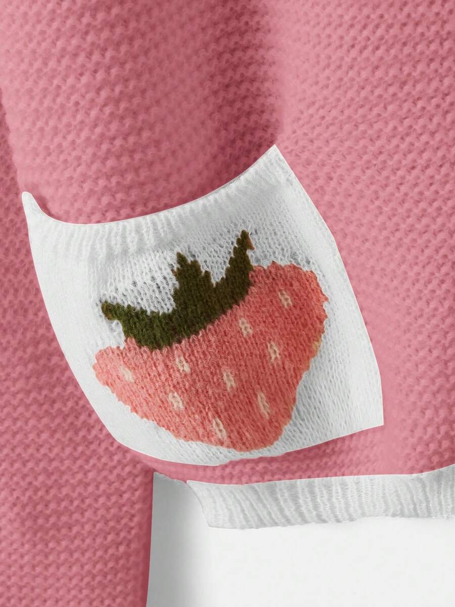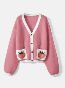 Kawaii Long Sleeve Contrast Stitching Button Front Top With Strawberry Print, Casual Daily Wear
