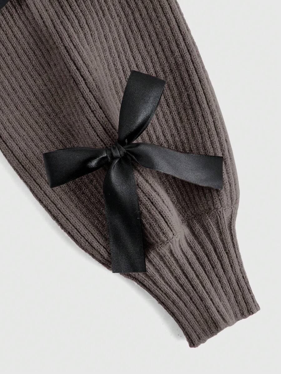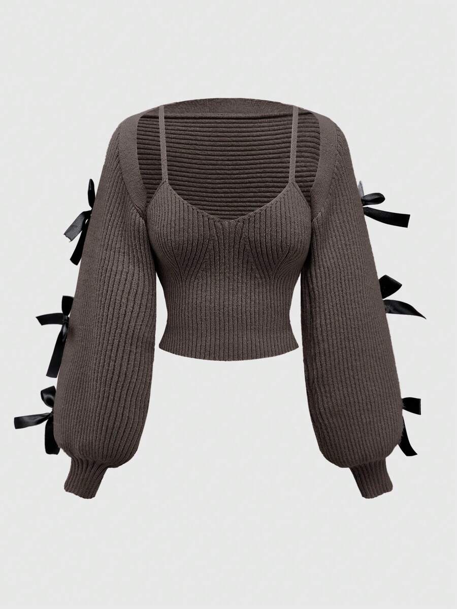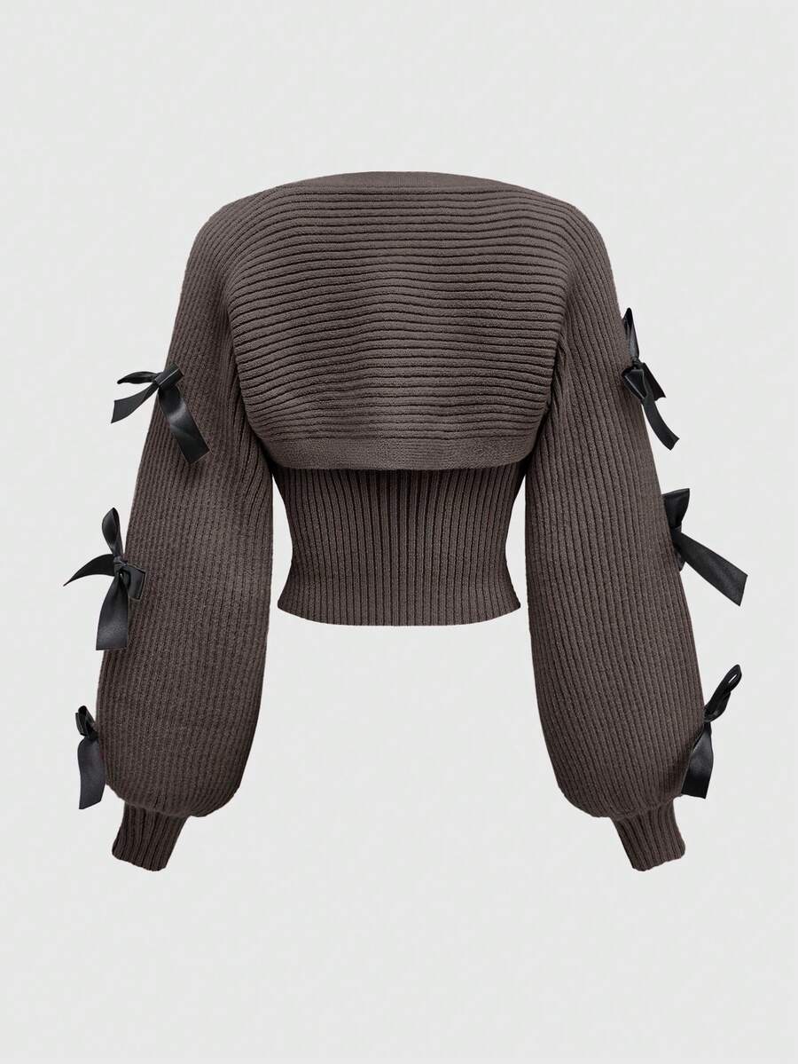 Kawaii New Year & Valentine's Day Casual Layered Cute Bow Tie Decor Women Lantern Sleeve Cover Up Shrug Vest Two Pieces Set