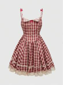 Kawaii Party Holiday Minimalist Sexy Academy Mori Style Checkered Contrast Lace Floral A-Line Princess Women's Dress, School