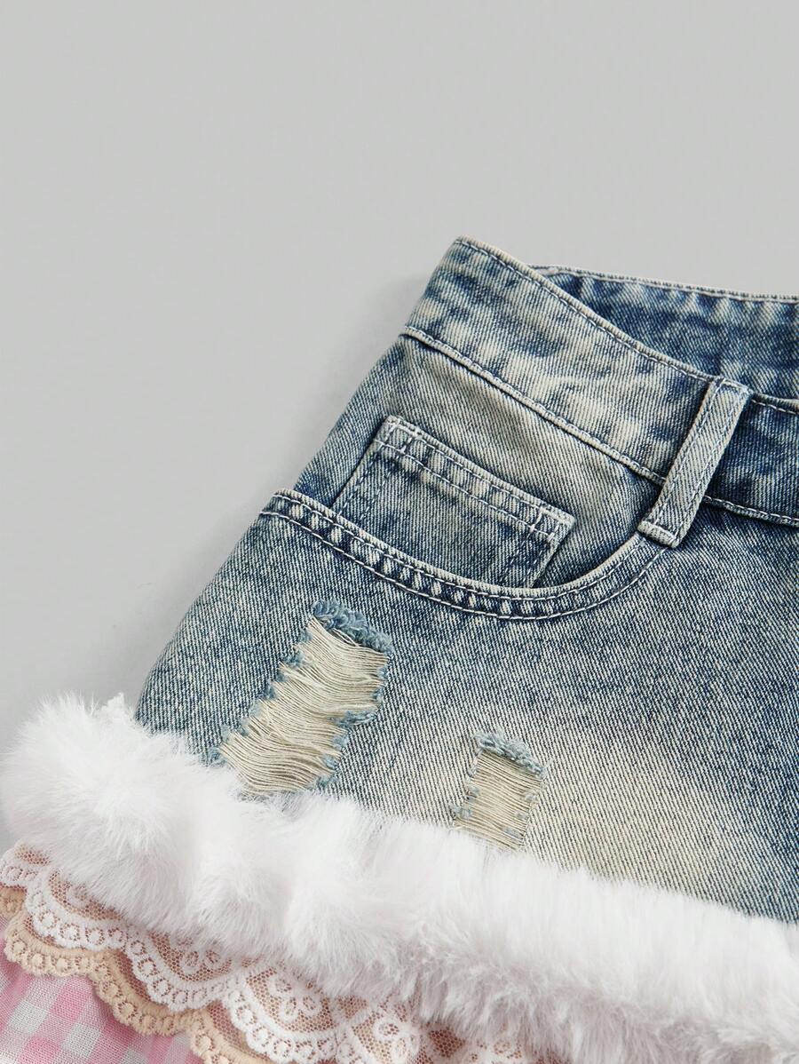 Kawaii Pink Plaid Lace Cute Denim Mini Skirt