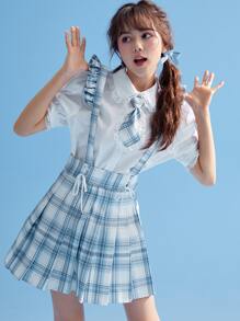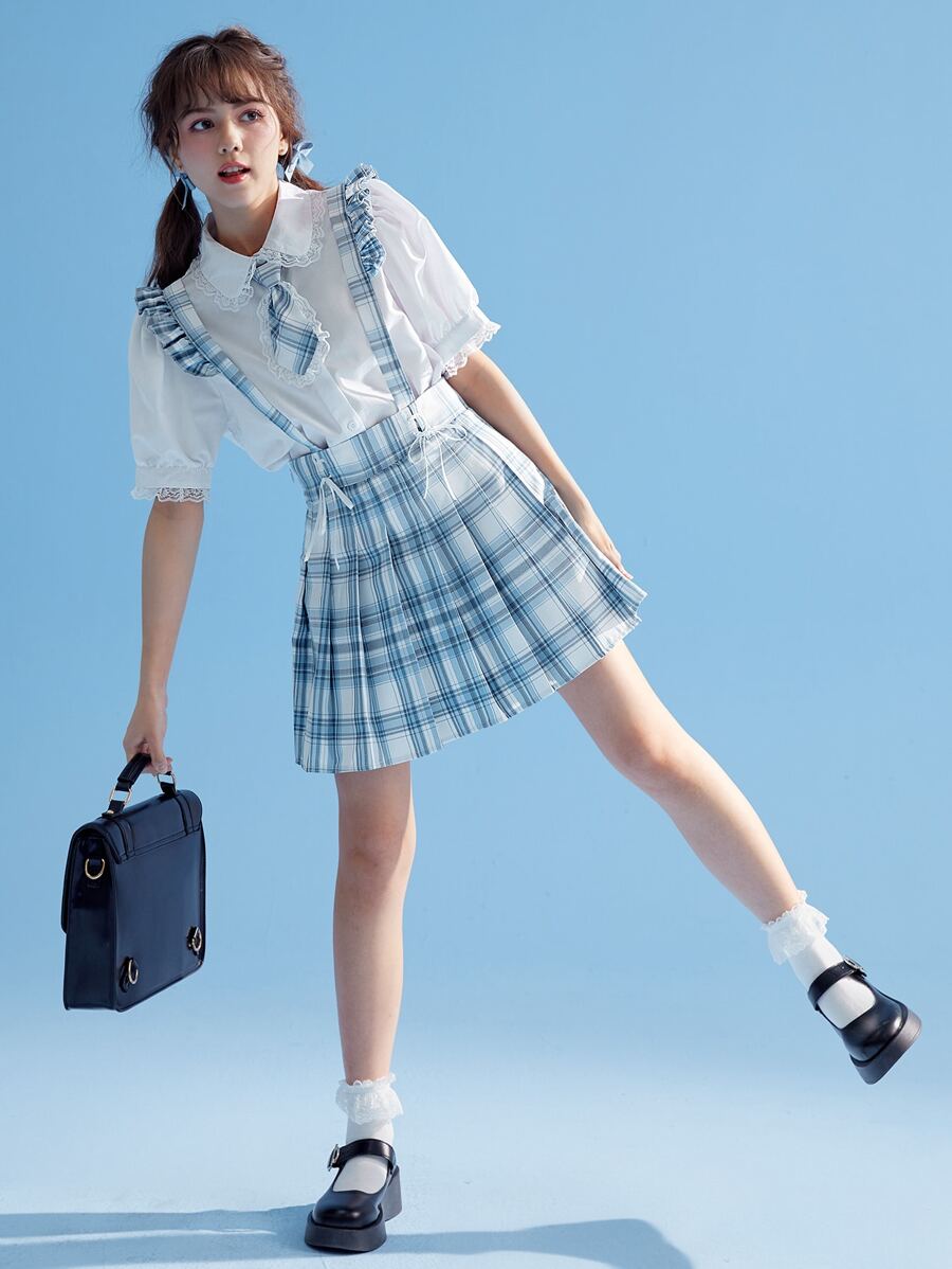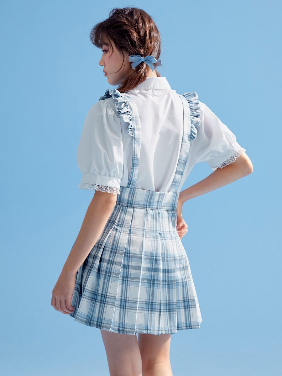 Kawaii Plaid Ruffle Trim Pleated Pinafore Skirt Without Tie