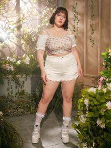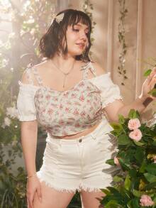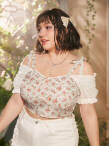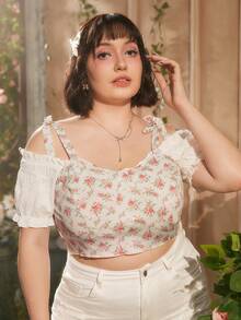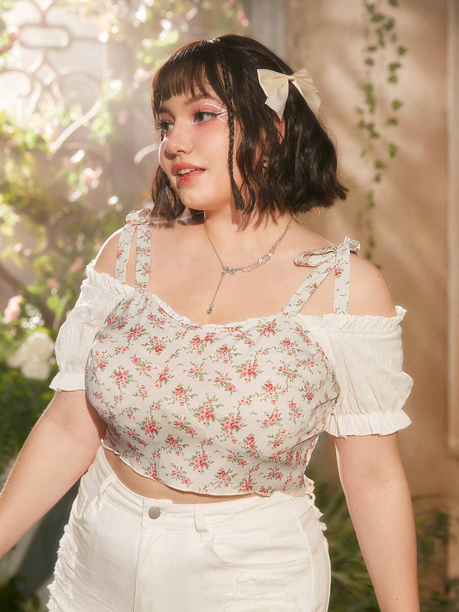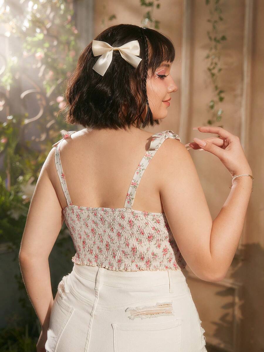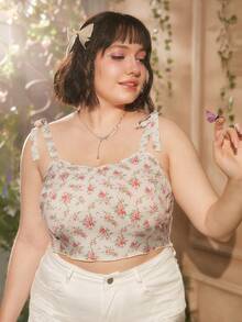 Kawaii Plus Ditsy Floral Print Shirred Crop Cami Top