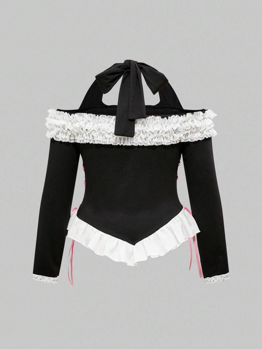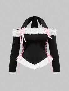 Kawaii Plus Size Autumn Kawaii Bowknot Lace Patchwork Long Sleeve T-Shirt, Plus Size Women Autumn/Winter Long Sleeve Top