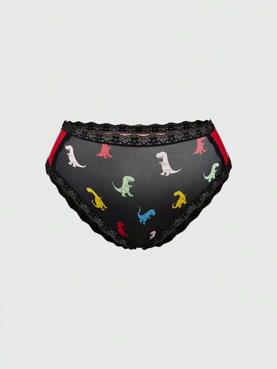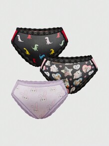 Kawaii Plus Size Cute Rabbit, Cat, Dinosaur Print Patchwork Milk And Mesh Lace Edge 3-Pack Panty Set