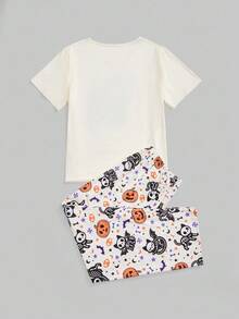 Kawaii Plus Size Halloween Cat Skull Bat Pumpkin Print Short Sleeve Pants Casual Pajama Set
