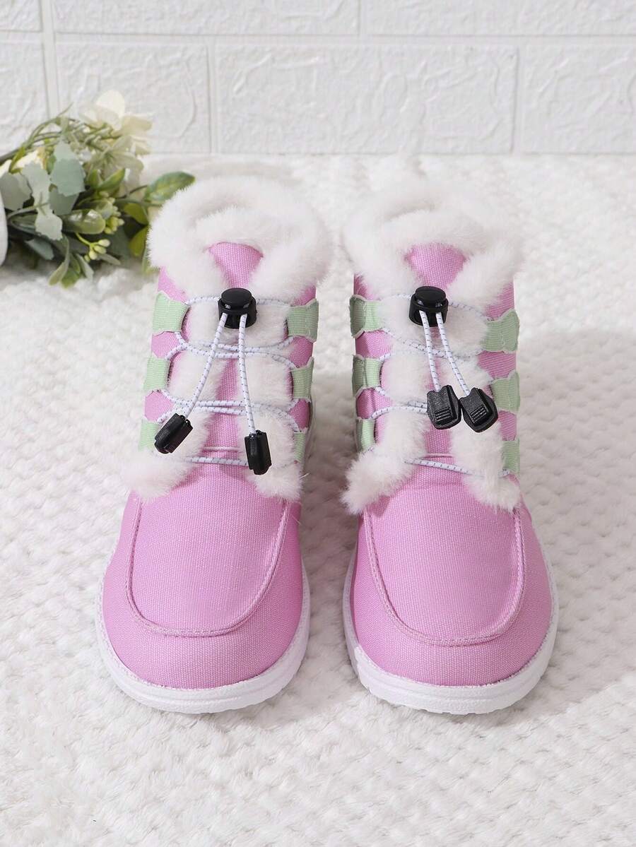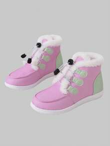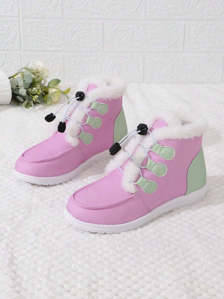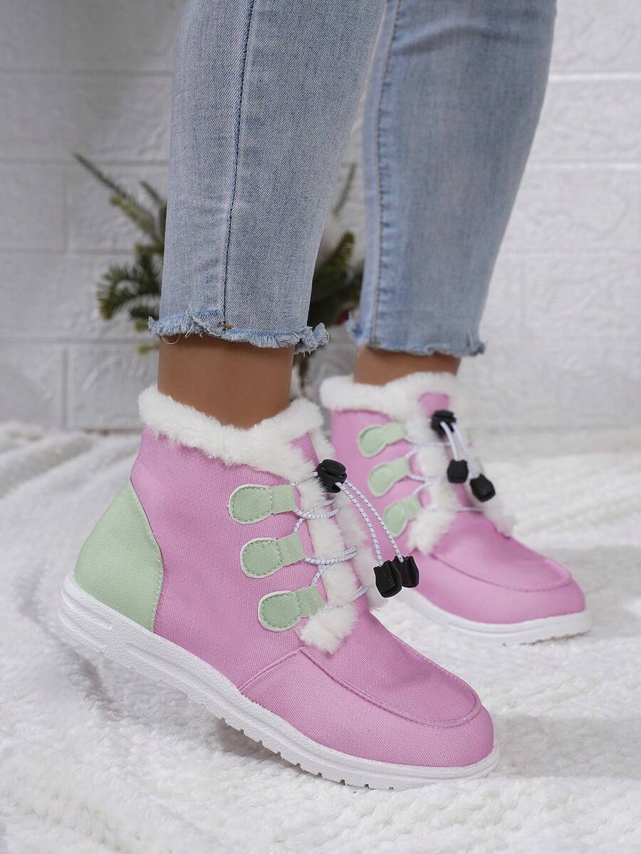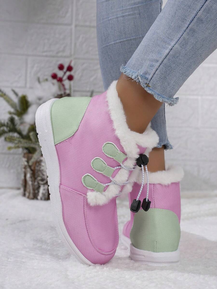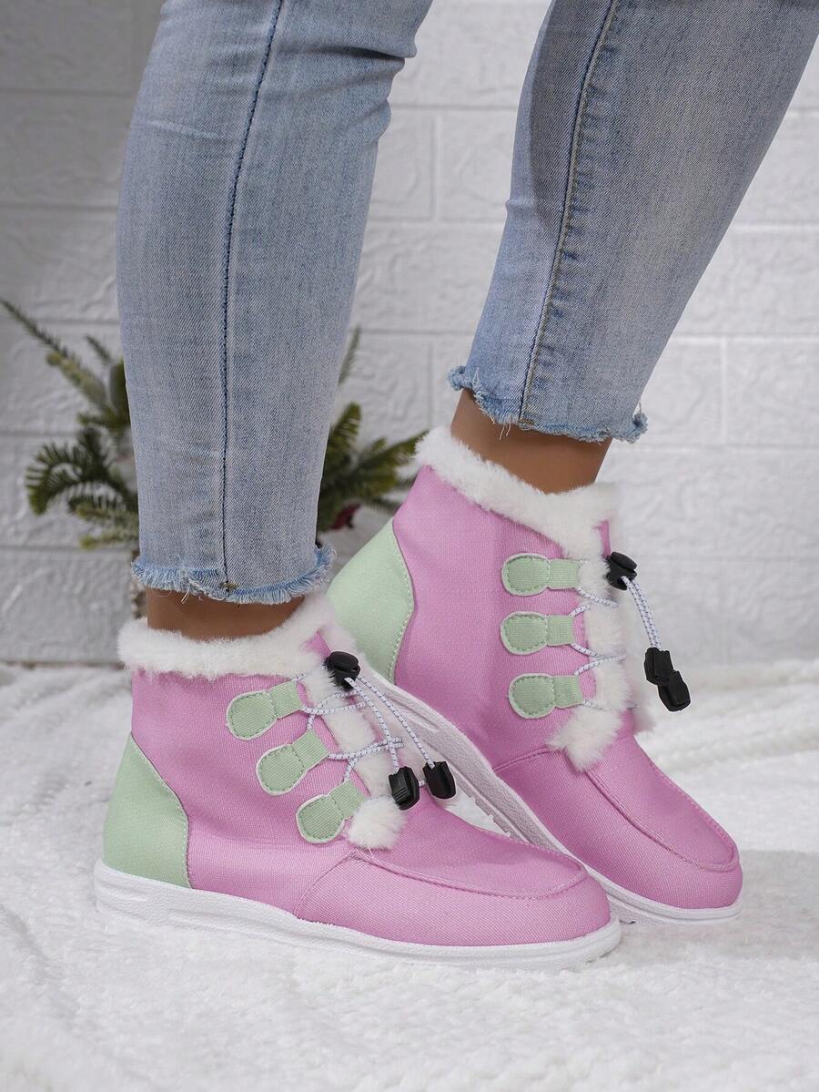 Kawaii Plus Size Pink Tie And Green Splice Fluffy Edge Design Thickened Casual Snow Boots With Platform