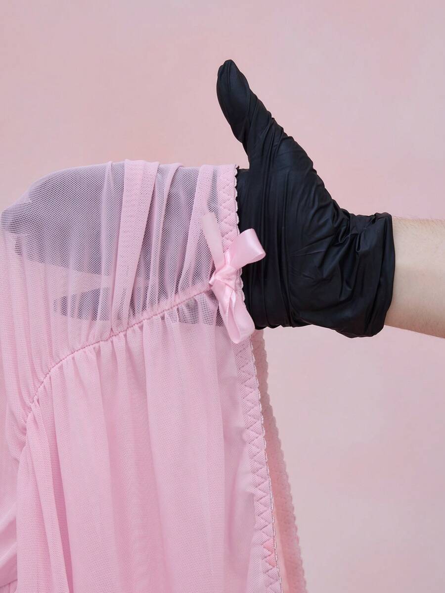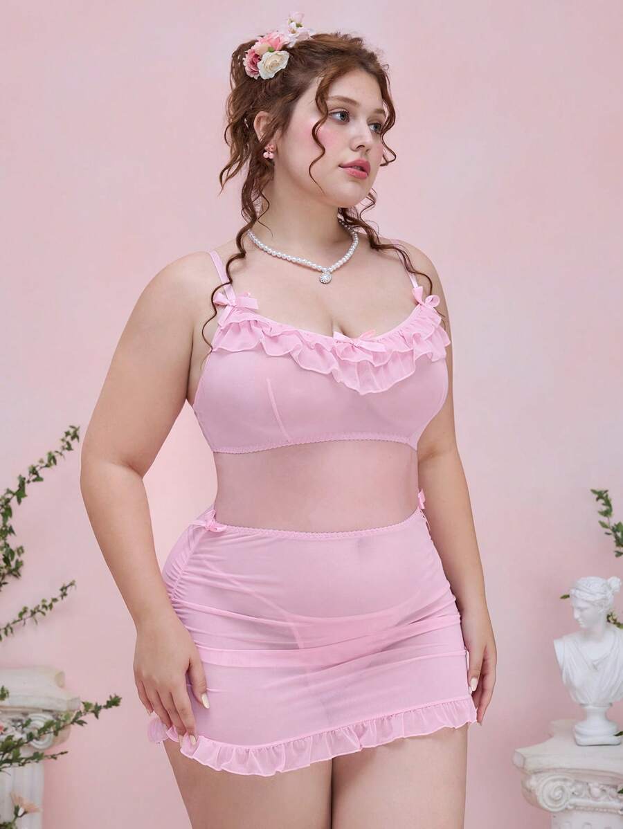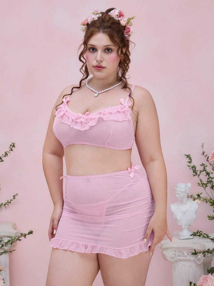 Kawaii Plus Size Ruffle Bow Decor Wireless Mesh Lingerie Set