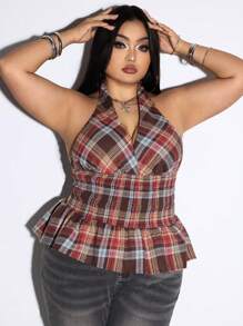 Kawaii Plus Size Sexy Checkered Backless Halter Shirt, Summer